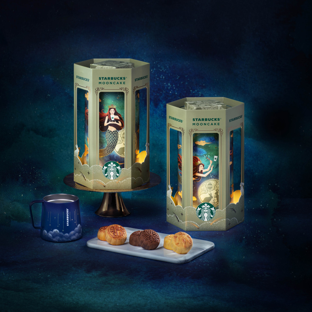 中秋节点亮花灯更添气氛。“星巴克月饼亮光走马灯礼盒”以品牌标志美人鱼,配搭中式走马花灯造型,花灯还附灯光及旋转设计,结合中西特色。月饼加入品牌咖啡茶饮为元素,创作了流心焦糖咖啡月饼、焙茶黑芝麻月饼、燕麦奶奶黄月饼三款创新口味,另每套礼盒附送一张中杯装(354ml)手调饮品券。