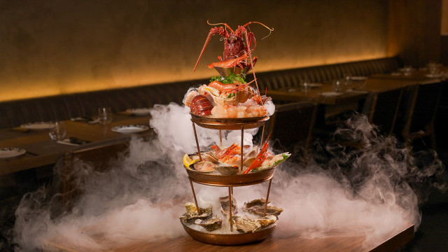 铜锣湾1601餐厅新推出4层高“鲜”气生蚝龙虾海鲜塔,足足有30吋,相当壮观! 海鲜塔每层都放满新鲜海鲜,有原只澳洲龙虾刺身、8只环球生蚝、4只黄金螺、2只活赤贝、4只北海道元贝、4只车厘蚬、4只加拿大牡丹虾、4小杯三文鱼籽配荧光鱿鱼。