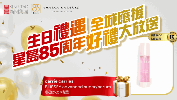 星岛85周年惊喜送礼第三弹正式开跑,大家只要于8月11日至17日参加《星岛头条》APP的“星岛85周年有奖问答游戏”,即有机会赢取由carrie carries送出的“韩国BLISSEY super/serum多漾水份精华”,共63份,总值$50,400。