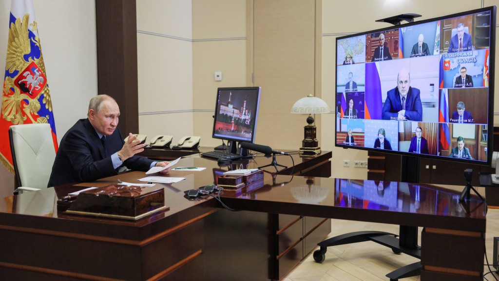 ▲普京在奥加廖沃(Novo-Ogaryovo)总统官邸中与政府官员视像会议。 路透社