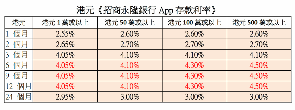 另外,招商永隆指,现时3、6、9、12个月定期存款息率均有上调,其中3、6、9个月港元定存均享4.1厘以上,12个月定存则享3.9厘,需以最少50万港元以上金额开立;若不足亦享分别2.55厘至4.05厘港元定存息率。