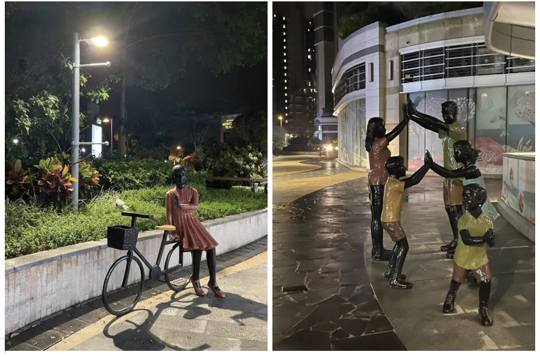 根据帖文附上的图片所见,屋苑地下范围内摆放了数个不同形态的艺术雕塑,全部都是以黑色金属材质为主,有坐在单车后座、穿上粉红色长裙的短发女孩;还有疑似在玩游戏的“一家五口”。