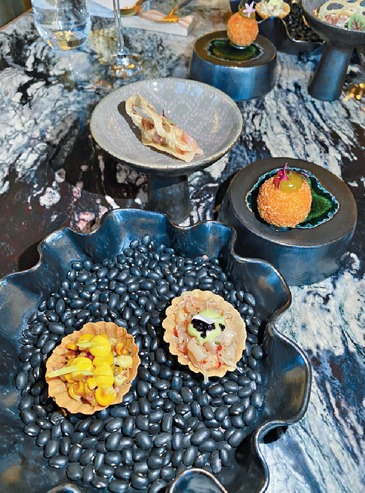 沿走当代泰式Fine Dining的菜馆装潢简约时尚、实而不华。这夜四道菜尝味晚餐($1,080/位),先送上Amuse Bouche餐前小食四重奏,自身淡甜细腻的Hamachi油甘鱼碎先经龙眼木烟薰,增添甜甜的果香和烟熏香气,用时佐以随附的Renkon Chip莲根脆片添香脆; Taro Puff芋头泡芙内裹芋头蓉和椰菜,香口惹味而散发咖喱辛香; 迷你玉米挞整体口感爽甜而附椰香; 一口甜虾挞味道甜酸,清新醒胃。