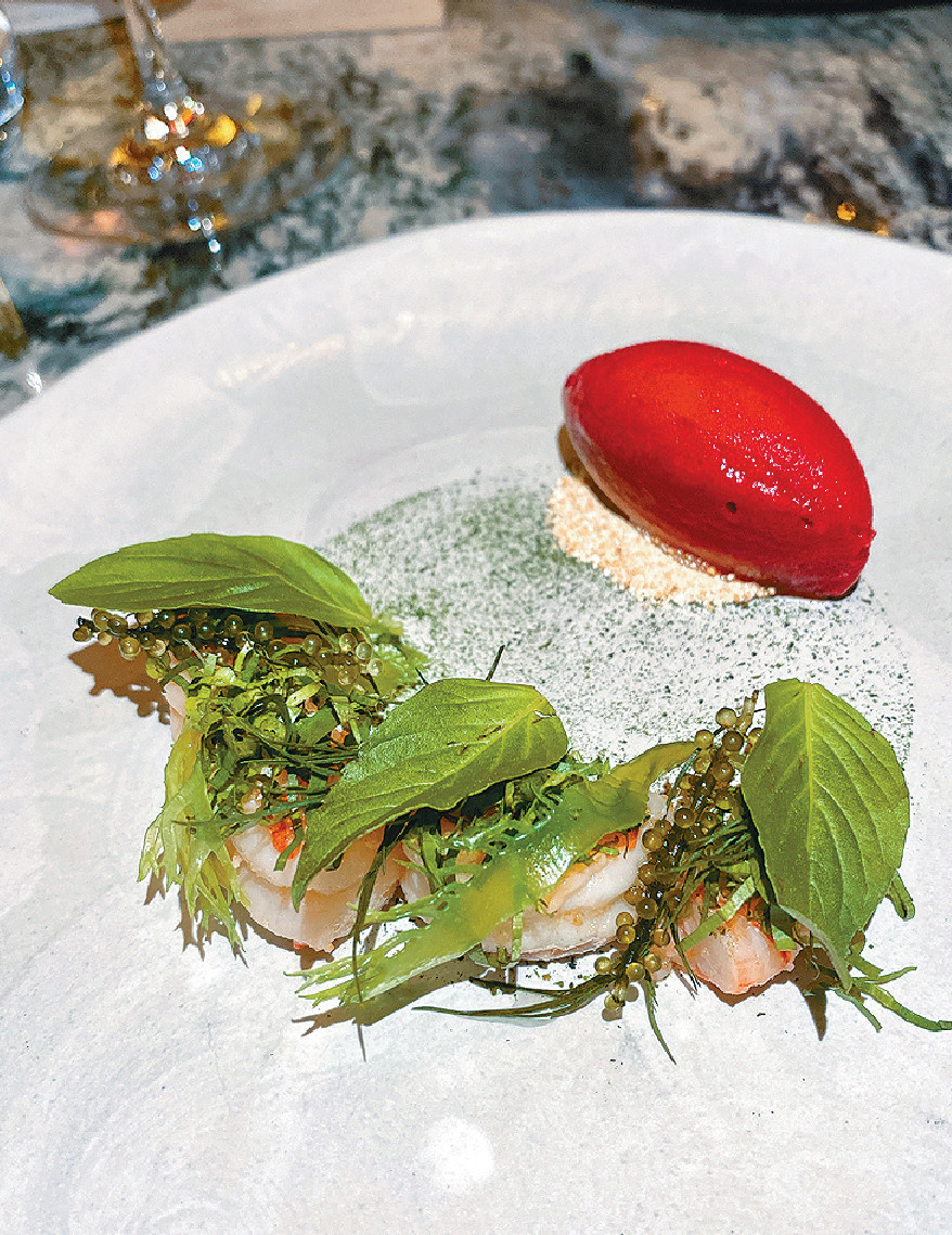 ▲鲜虾配海葡萄伴红菜头雪葩。