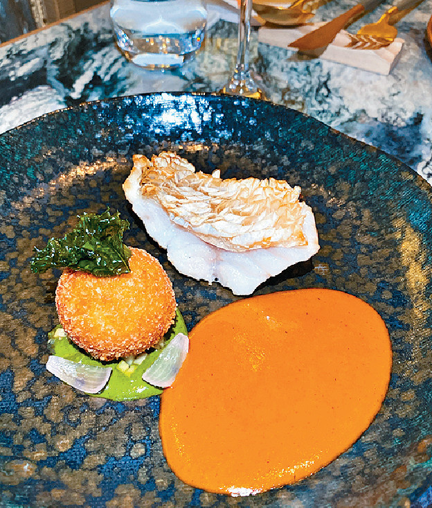 接着的第二道菜,提供Amadai甘鲷或松叶蟹供选择,甘鲷自身肉质鲜美稠密,配合经油泡炸煮至片片高耸、口感香脆的鱼鳞,用时醮上少许Choo Chee Curry红咖喱添香辣; 随附的配菜炸免治猪肉虾球,分别以羽衣甘蓝慕丝、羽衣甘蓝茎粒、羽衣甘蓝叶、羽衣甘蓝干衬托,以羽衣甘蓝的四重风味,提升炸物的味道口感,同时食材尽用,识食惜食。