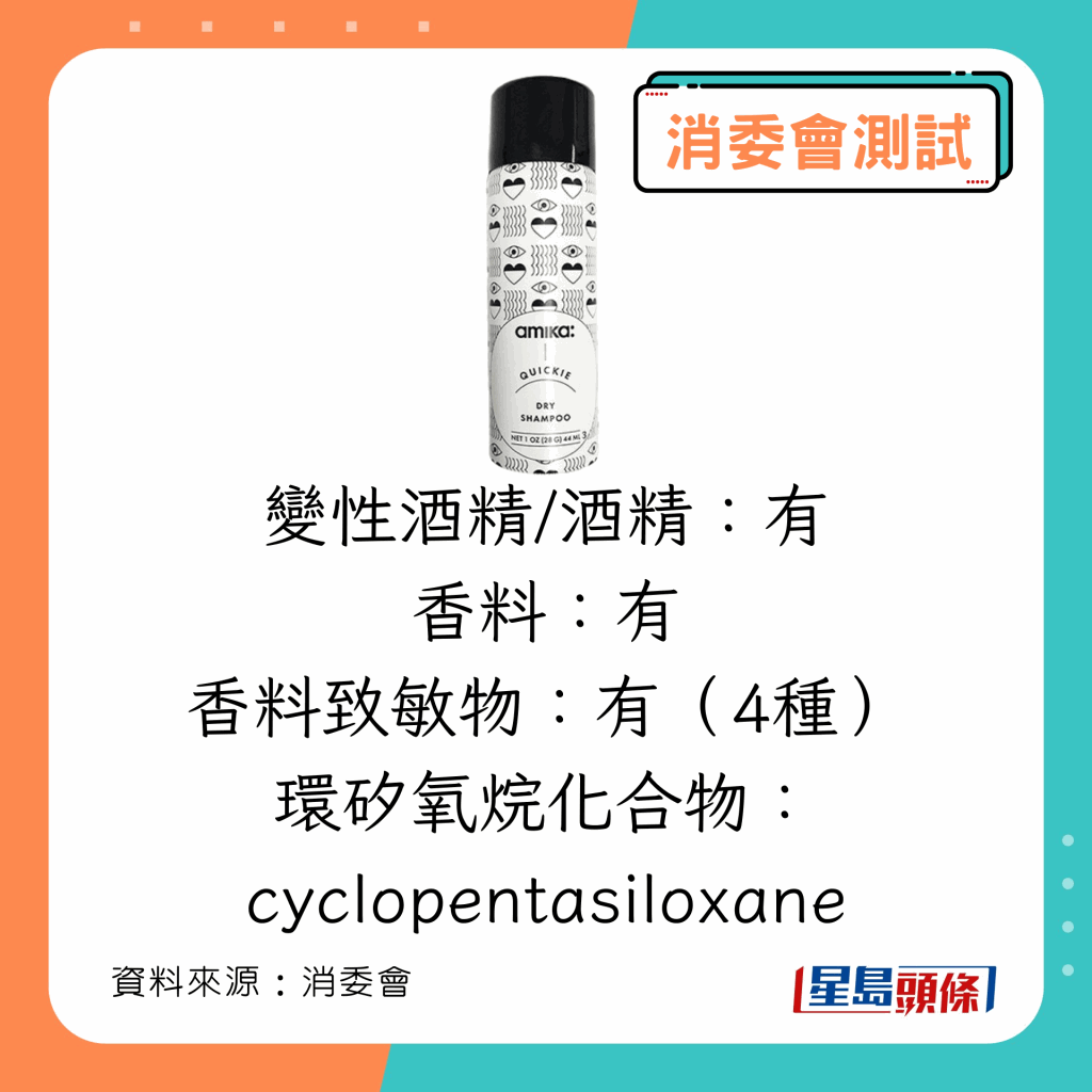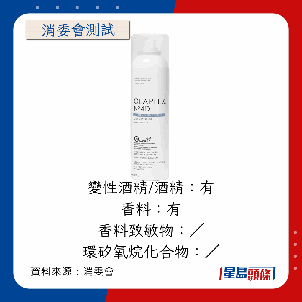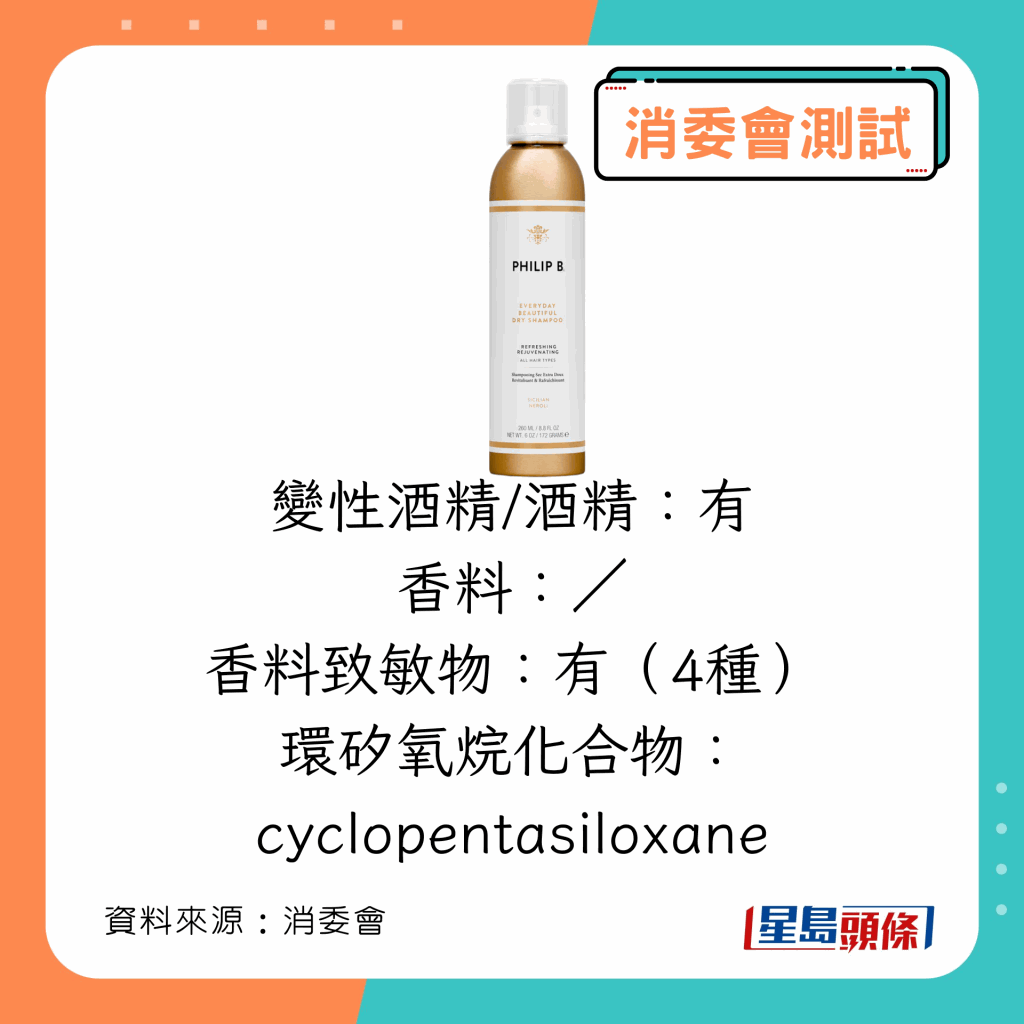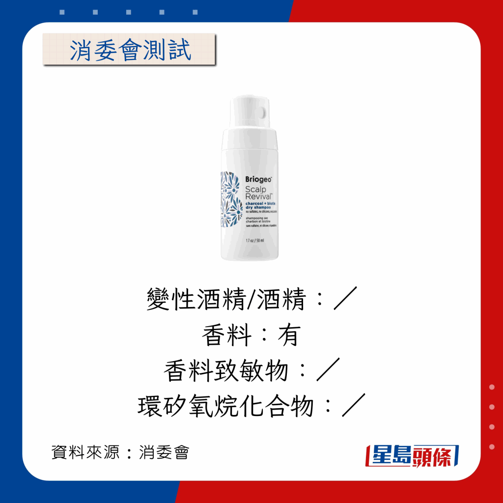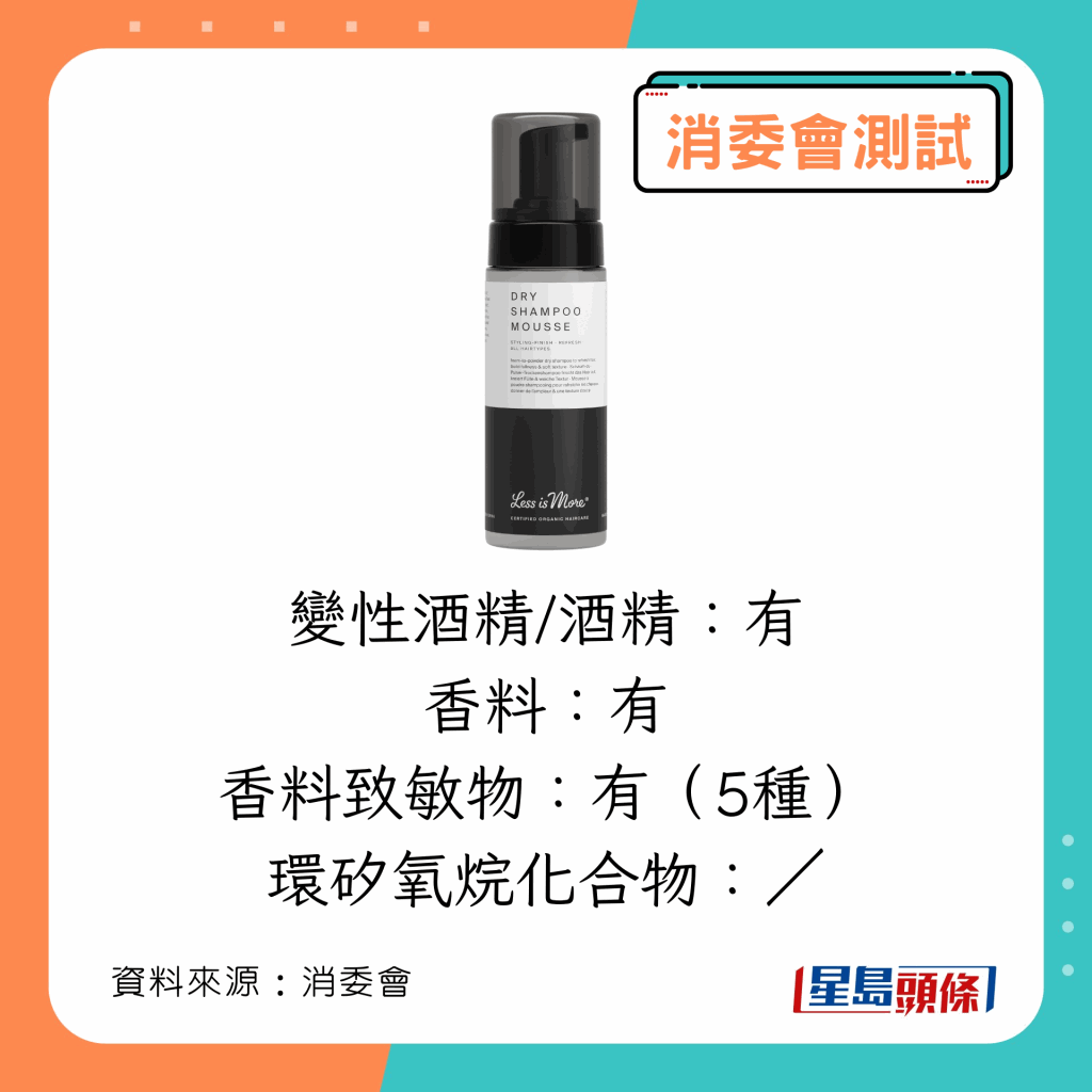 消委会是次检视的样本中,11款压缩气罐产品全部标示含丙烷、丁烷、异丁烷,或氢氟碳化合物152a等石油气气体成分,当中有4款同时标示含有环硅氧烷化合物D5及/或D6。虽然海外研究指出并非所有压缩气罐装产品都存有高浓度苯,而本会检视的压缩气罐样本中亦不是全部都标示含有环硅氧烷化合物,而现时亦没有证据显示间中使用免冲水洗发产品会对人体产生危害,但以安全和环保等考虑因素,消委会建议消费者尽量减少使用含石油气气体成分和环硅氧烷化合物的产品,改用其他配方较简单的免冲水洗发产品。