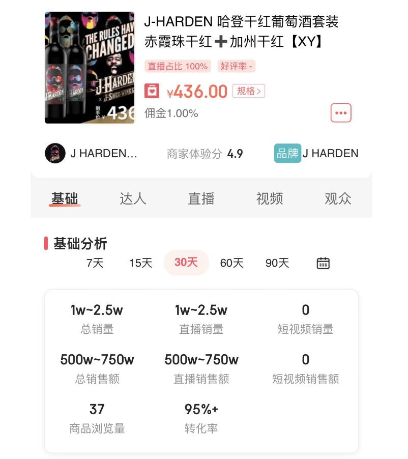 澎湃新闻报道,近日访问中国的NBA球星哈登,除了参加篮球活动和游艇派对外,哈登还空降疯狂小杨哥直播间,体验直播带货。 此次小杨哥带货商品为哈登的个人品牌红酒J-HARDEN,直播间内,5000套(一套两瓶)单价436元(人民币,下同)的红酒套装在上架后短短5秒钟内售罄,实现销售额218万元,哈登看完直呼:“NO way!”并亲自走到电脑屏幕查看销售记录,小杨哥大笑,“他难以置信,登哥难以置信啊”。 等到确认属实之后,哈登直接开心地翻跟斗。