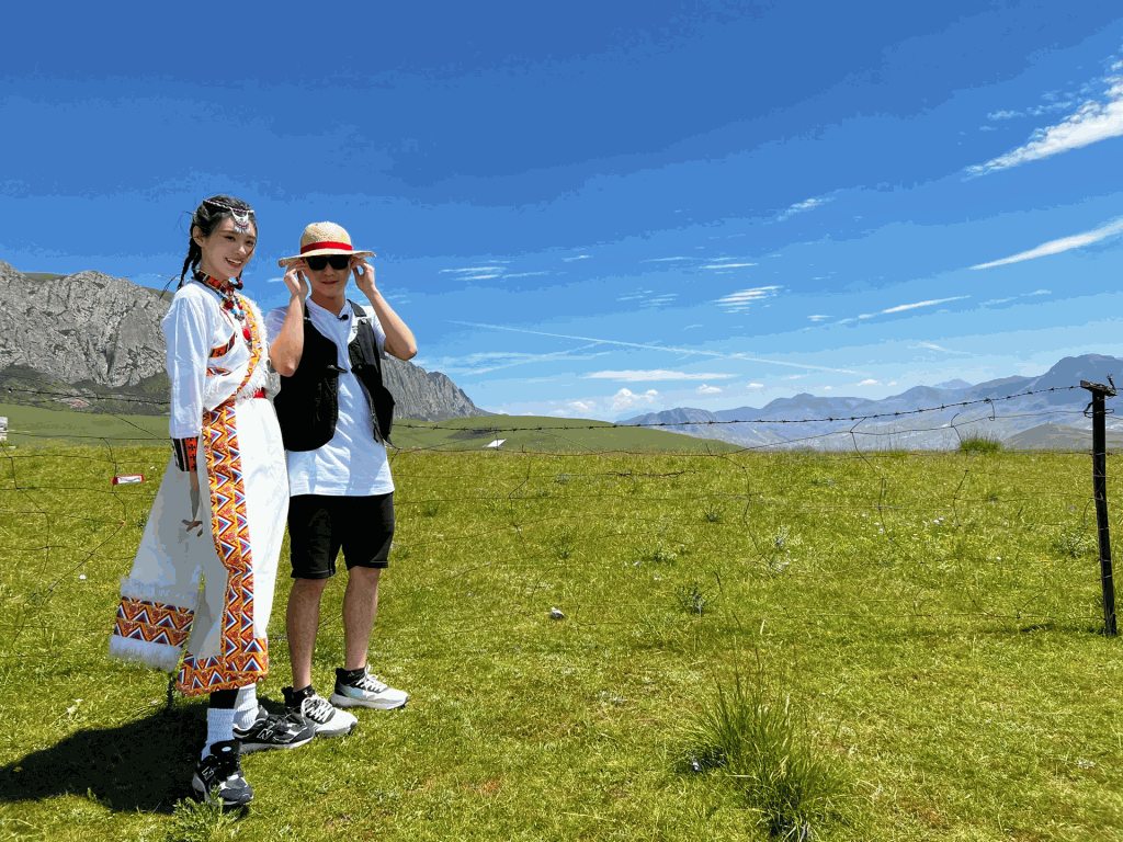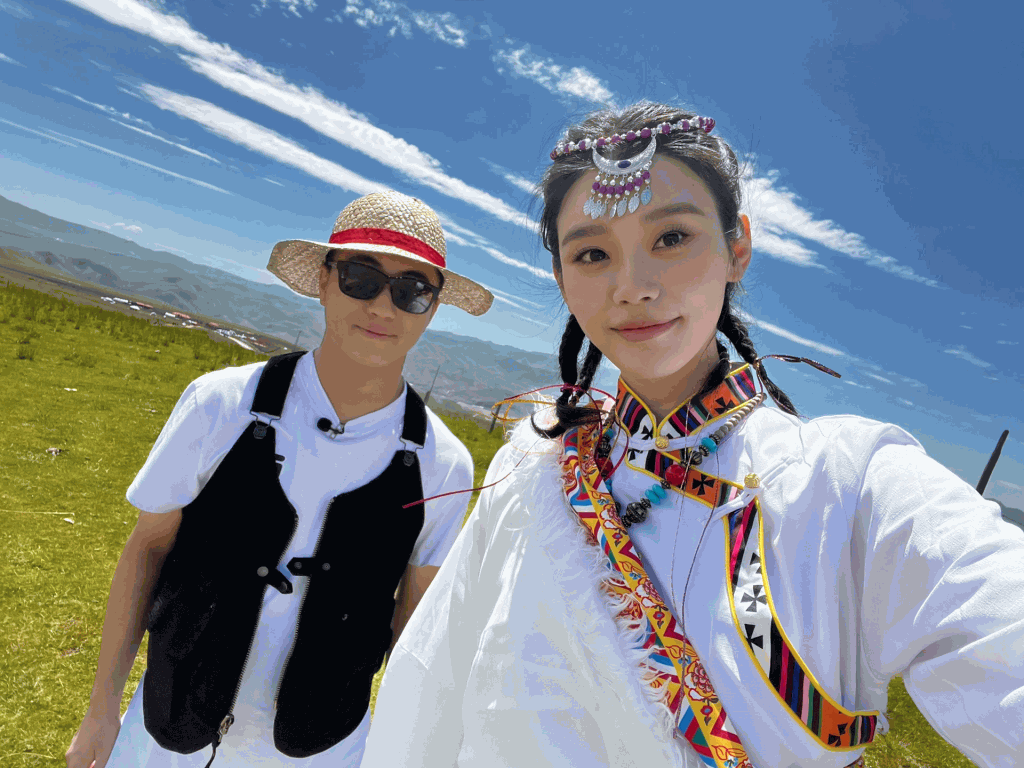 奚梦瑶昨日(19日)在社交网分享与老公拍摄《向山海出发》的照片,身材高䠷的奚梦瑶身穿白色藏族民族服饰,站在一望无际的草源上,显得清丽脱俗。不过老公何猷君却戴上有红色布条装饰的草帽,身穿白tee加背心与短裤、波鞋,还戴上太阳眼镜,却因为头上草帽,令他的造型与《海贼王》主角路飞离奇地相似,就连奚梦瑶也留言嘲讽老公:“藏族姑娘与海贼王的日常。”