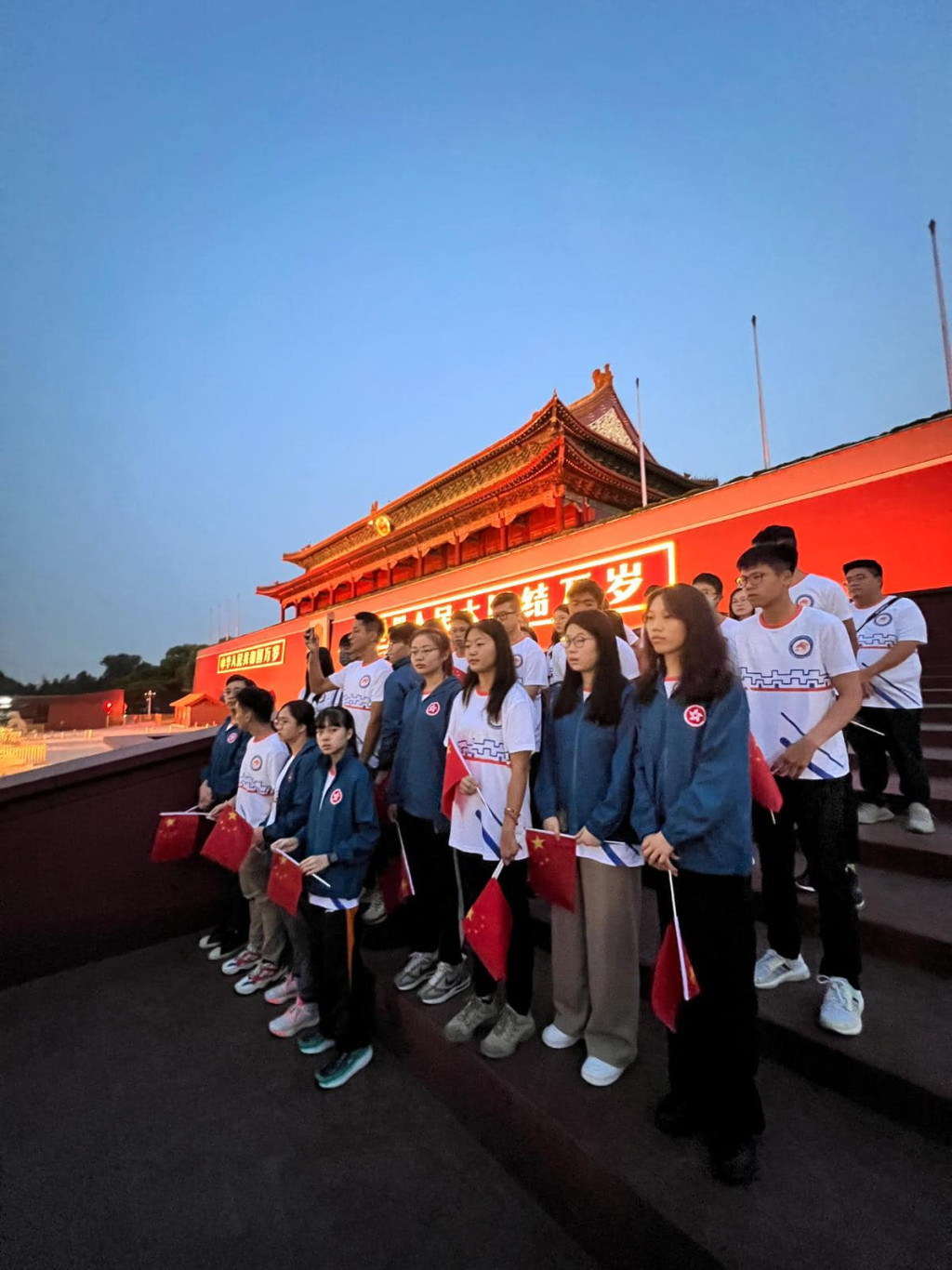 保安局局长邓炳强早前带领局方的青年团队到北京考察,局方今日(20日)在社交专页发文,指学员周六(19日)参观市内的企业后立即休息,仍未日出便起床与局长邓炳强一起前往天安门广场观赏升旗仪式。