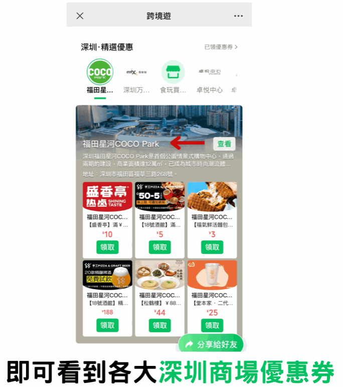 WeChat微信用户只需点击“我”,再选择“服务”,按“跨境游”,进入“商场名字”页面,即可领取6大商场优惠券,下单时向店员出示优惠券,跟随指示完成换领或付款步骤即可。深圳商场优惠包括: