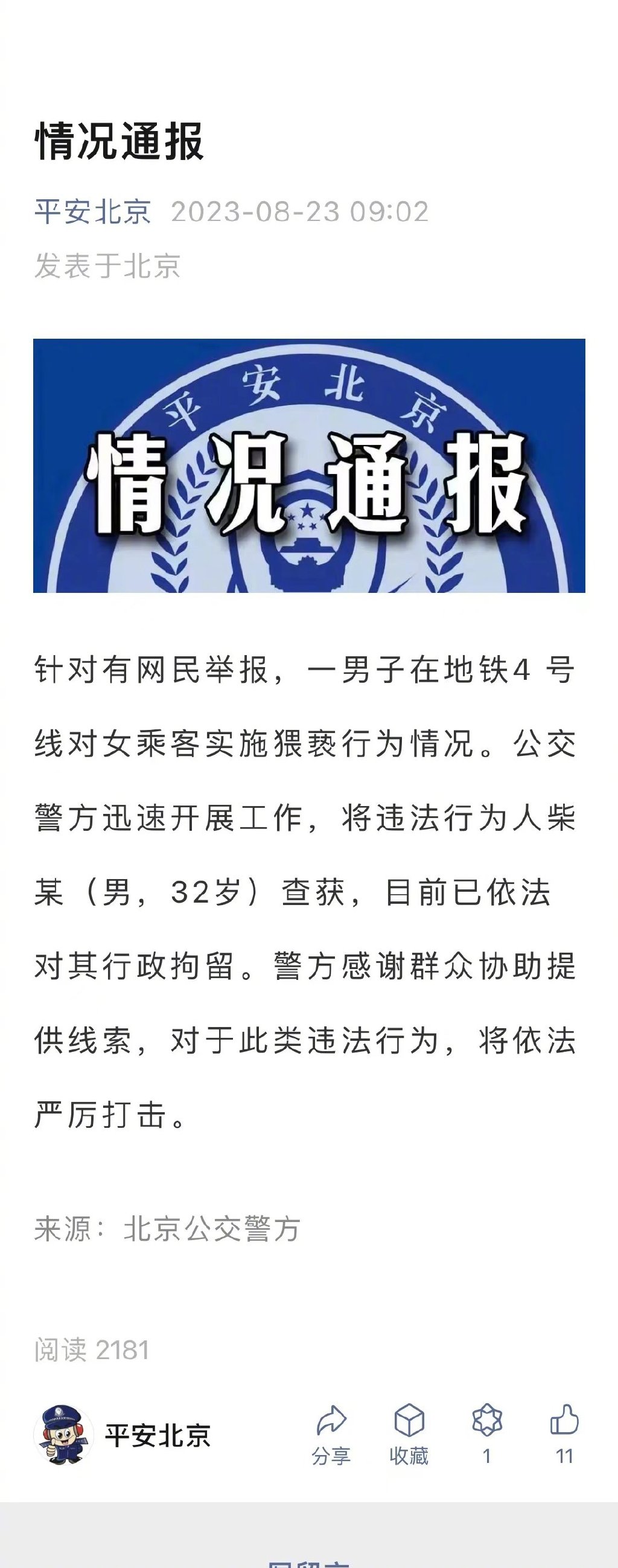 地铁官方8月22日回应:已注意到相关信息!北京警方今日通报,针对有网民举报,一男子在地铁4号线对女乘客实施猥亵行为情况。公交警方迅速开展工作,将违法行为人柴某(男,32岁)查获,目前已依法对其行政拘留。 警方感谢群众协助提供线索,对于此类违法行为,将依法严厉打击。