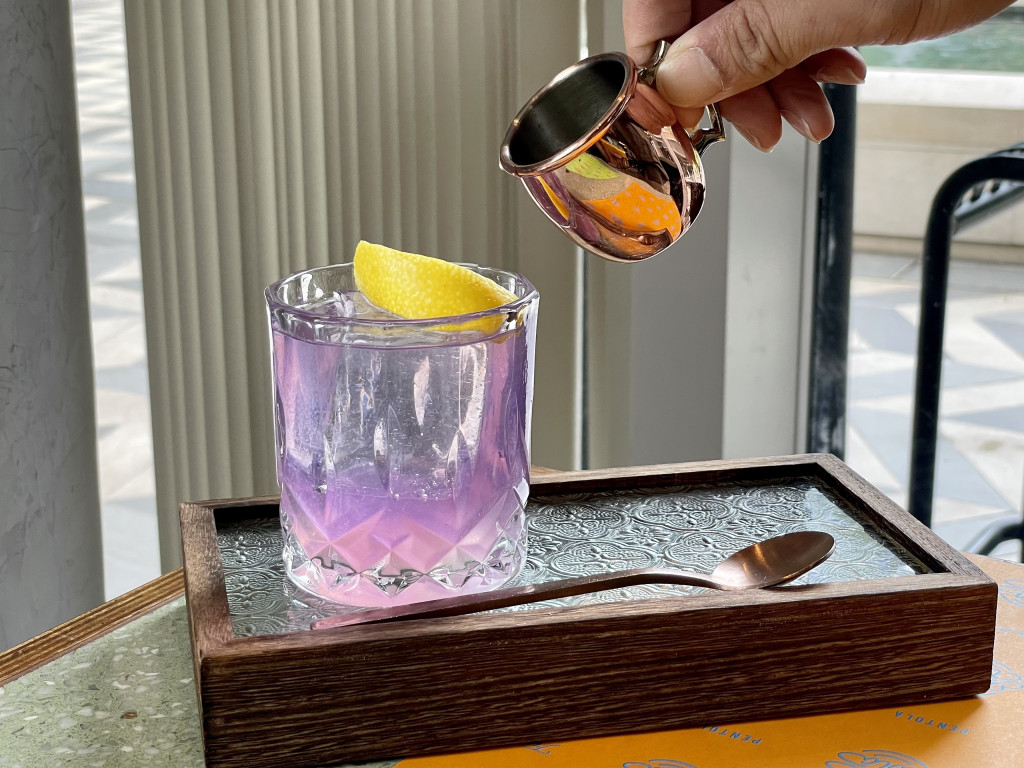 ▲Sweet Dream(HK$98)将蝶豆花加入品牌“白兰树下”毡酒,倒入柠檬汁,鸡尾酒颜色随即由蓝转紫,打卡一流!