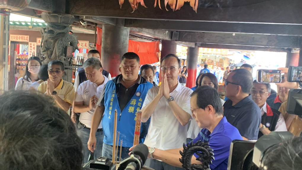 ▲朱立伦到南投竹山紫南宫参拜,祈求侯友宜与“立委”提名人游颢都能顺利当选。中时网