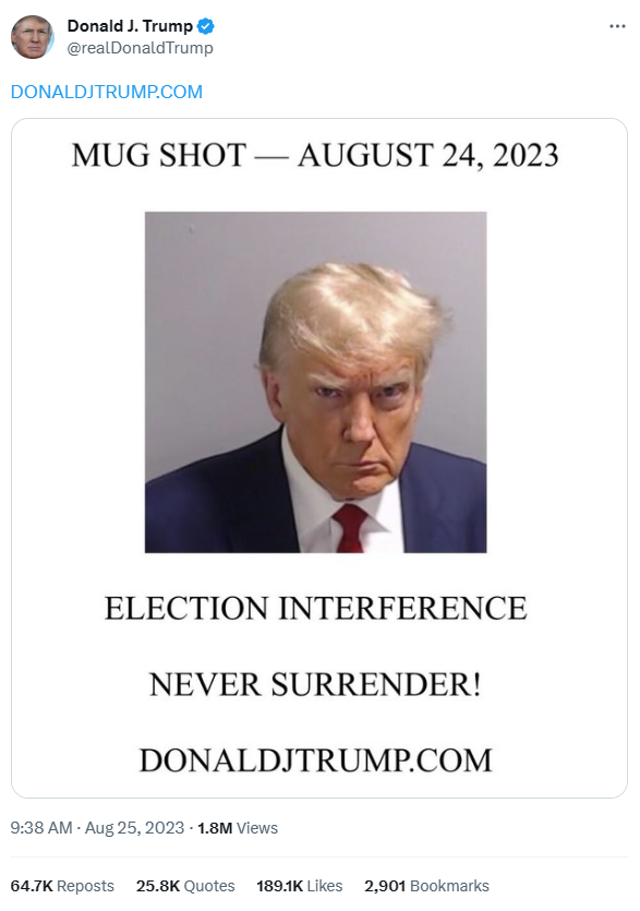 CNN称,这篇帖子中附上了特朗普在监狱中拍摄的嫌犯照片,在这张照片的下方,写着“干预选举”与“永不投降!”。