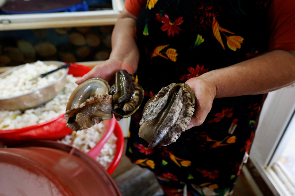 ▲韩国海女23日展示捕获的海鲜。