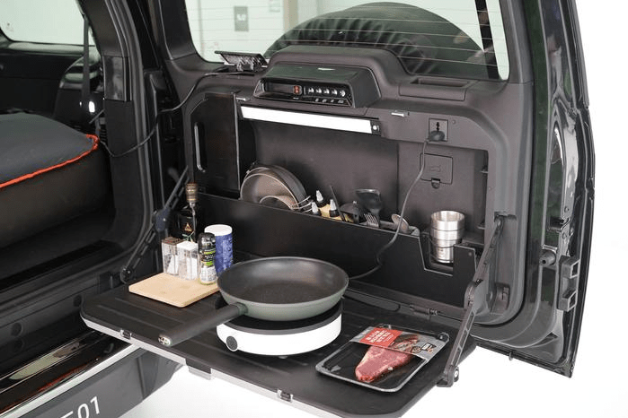 车主可以选择在尾门加装原厂餐厨系统,将流动厨房搬到车上,“厨房”储物空间可以容纳不同餐具,除了即热饮水机,还有可作备餐及放置电磁炉的收纳式工作枱,而煮食器具可以利用尾门的220V插头取电,另机侧亦有2.2kW的V2L插口用作连接其他电器,可说是一款很懂得露营情趣的电动SUV。