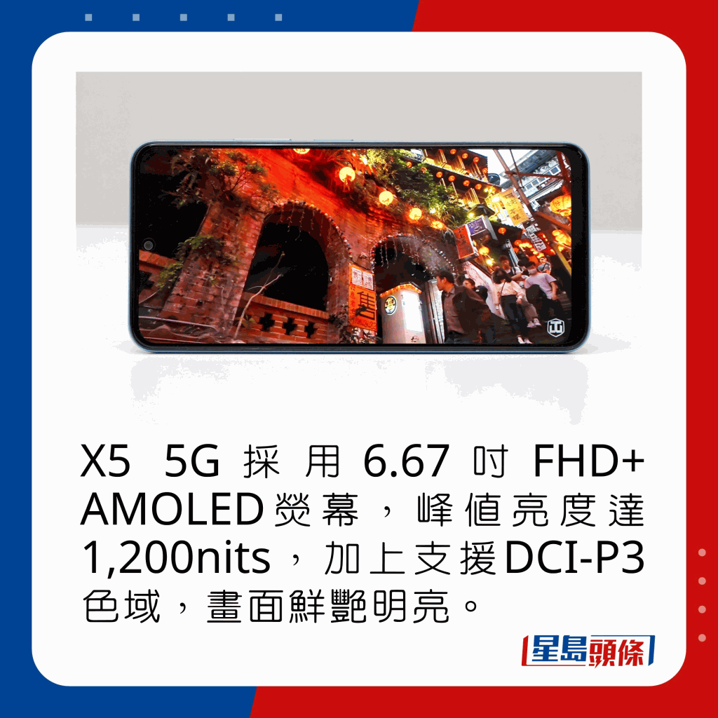 小米旗下POCO向来以高性价比作招徕,这款Android入门5G手机X5 5G也不例外,售价不用HK$2,000,不但用上支援120Hz更新率的6.67吋FHD AMOLED荧幕(解像度2,400×1,080),且拥有1,200nits峰值亮度,处理器也是性能较佳的S695 5G,加上内置最高8GB RAM,效能也是5款推介中最好。影拍方面,X5 5G装有48MP广角主镜、8MP超广角及2MP微距,前置镜头为13MP,成像质素及格。值得一提的是,X5 5G机身除了找到3.5mm耳机插口,还保留红外线埠,可充当万能遥控。