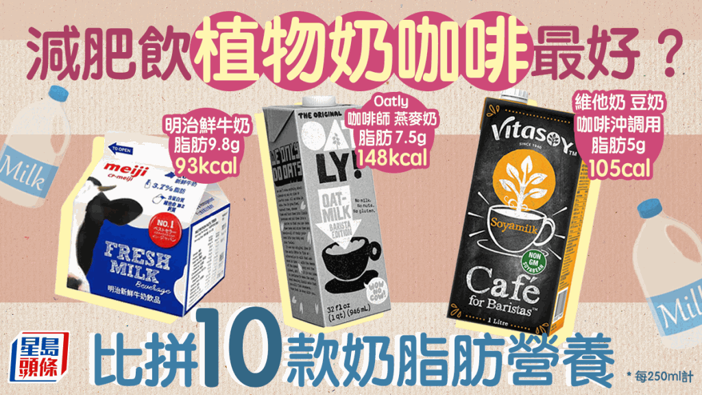 饮咖啡时选择植物奶就不易致肥?到底选择牛奶、燕麦奶、杏仁奶还是豆奶好?“尚营坊”营养师团队为爱喝咖啡人士分析哪些属较健康的选择,比较10款咖啡冲调奶的脂肪、卡路里、钙质等营养成分,当中包括市面常见品牌“Oatly”、“维他”和“明治”的冲调奶。