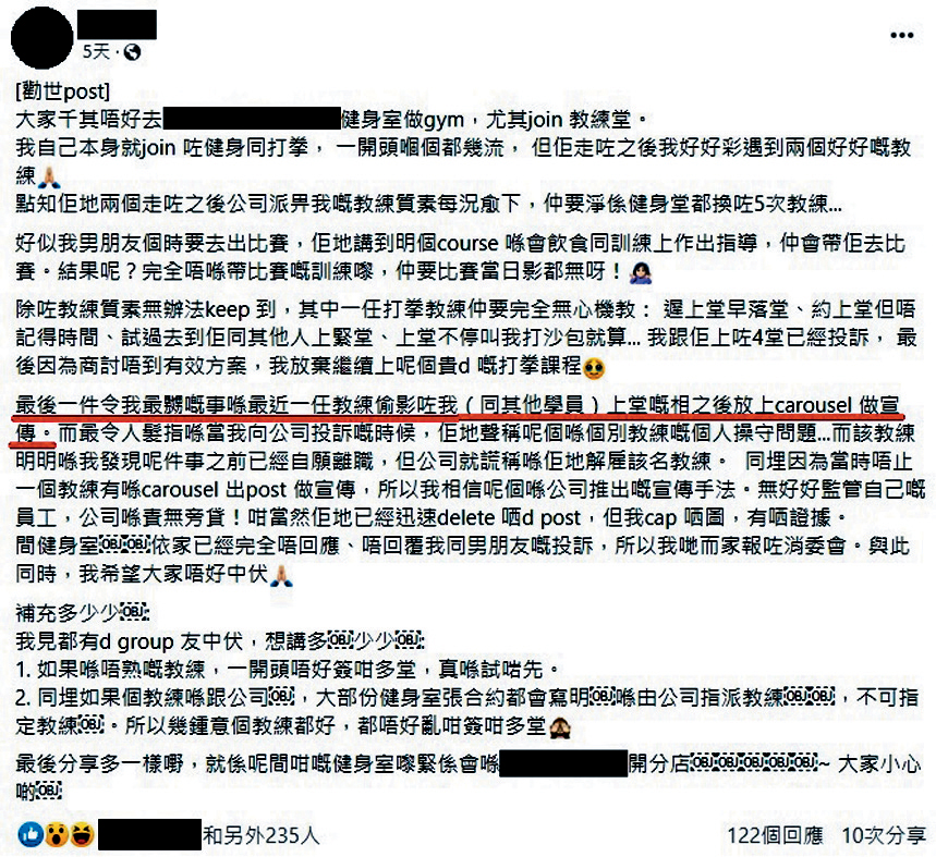 黄小姐分享,其教练于今年2月离职,但中心安排的新教练态度欠奉,“教练上课时很‘迷茫’,若原先计划使用的机械有他人使用,会和我一同空等不知所措。”她坦言,经投诉后转过3至4位教练仍不似预期,加上中心向她作出传销,多项因素已令她萌生去意。及后,该教练在上课时偷拍她和其他学员的照片,在未得到她们同意下上载至拍卖平台,用作宣传其个人健身课程,各人的容貌更是清晰可见。她发现,涉事中心有其他教练也用相同手法宣传,无奈向健身中心投诉后,相关帖文被秒速删除,中心声称已解僱涉事教练,而且事件是教练的个人操守问题,与中心无关。