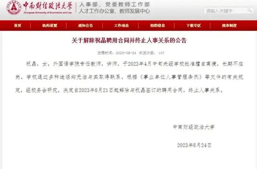 首页>内地>社会 大学外语教师被揭长期不上班更出国玩失踪,下场曝光 发布时间:2023-08-30 13:55 中南财经政法大学一名外语教师,未经学校批准擅自离境,更长期没有上班,终于被校方解雇。 中南财经政法大学近日发布关于解除祝晶聘用合同并终止人事关系的公告,祝晶,女,外国语学院专任教师,讲师,未经学校批准擅自离境,长期不在岗,学校无法与其取得联系。 ▲女教师擅自离境失踪,长期不在岗,高校通报。 根据《事业单位人事管理条例》等文件的有关规定,经校务会研究,决定自2023年8月21日起解除与祝晶签订的聘用合同,终止人事关系。 相关阅读 专题 更多 > 中芯国际上半年营收预计超22亿美元,四季度将试产7nm工艺 太兴盈喜料多赚逾3倍,指将坚守审慎理财政策 中国移动半年多赚5%,中期息增近6% 清华女学霸创业、一年一融资,镁佳股份估值9.3亿美元冲刺港交所 应收账款走高,丰沃股份三成收入打“白条” 惠科股份IPO:获政府补助超53亿,向实控人堂弟采购超8亿 关税战|白宫:特朗普签行政命令,对华关税暂缓期再延长90日 高盛:64%关税成本由美企“买单”,消费者仅承担22% 美媒:特朗普政府通过关税施压,要求买美国军火 热门文章 美国美女教师激战11岁男学生,私生子长相揭发惊人真相 妹子遭“黄痰、鼻涕”抹下体超崩溃,男友只喊这句话 大罢免朱立伦竟出这高招,郭正亮曝结局:民进党至少倒5个 新疆女生长相神似“张曼玉”爆红,本人羞回:做梦都会笑醒 奇闻秘史︱清朝22岁最后武状元,凭“执生”赢光绪欢心霍元甲都认输 特朗普1月20日上任美国总统,就职典礼8大重点率先看 蔡壁如选民众党主席有赢面?媒体揭3动机博声量最大化 你是否赞成台湾执行死刑?最新网络民调太震撼网友一面倒 看到柯建铭近日举动,沈富雄示警:没有处理是空前大危机 万千星辉颁奖典礼2024丨年度最高点击剧集片段头5位出炉
