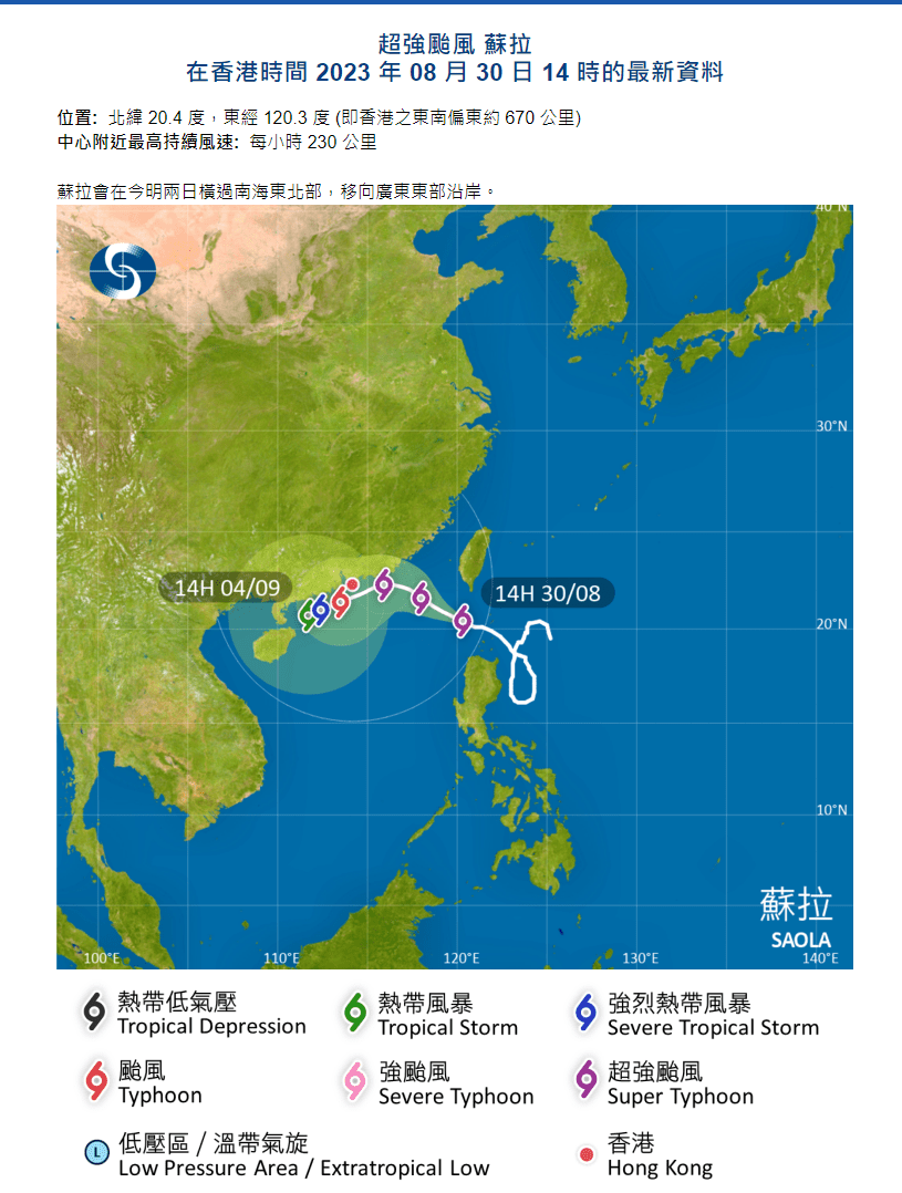 【17:45】按照现时预测路径,苏拉会在今晚至明早仍与本港维持超过300公里距离,一号戒备信号会在明日(31日)中午前维持。随着苏拉靠近广东东部沿岸,天文台明日稍后会改发三号强风信号。预料苏拉会在周五至周六(9月1至2日)颇为接近珠江口一带,香港会有狂风骤雨,风势进一步增强。随后苏拉可能受东北季候风及热带气旋海葵影响,其路径及强度仍有变数。