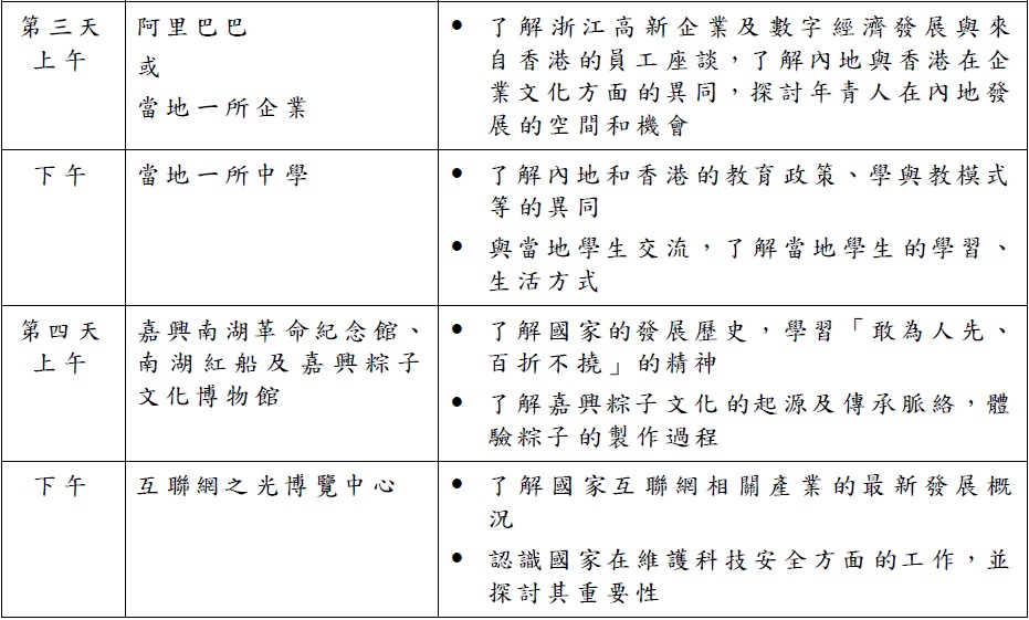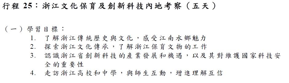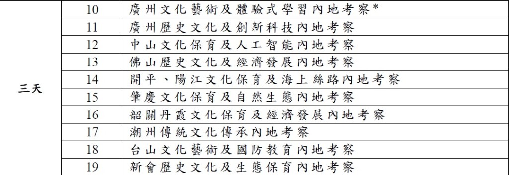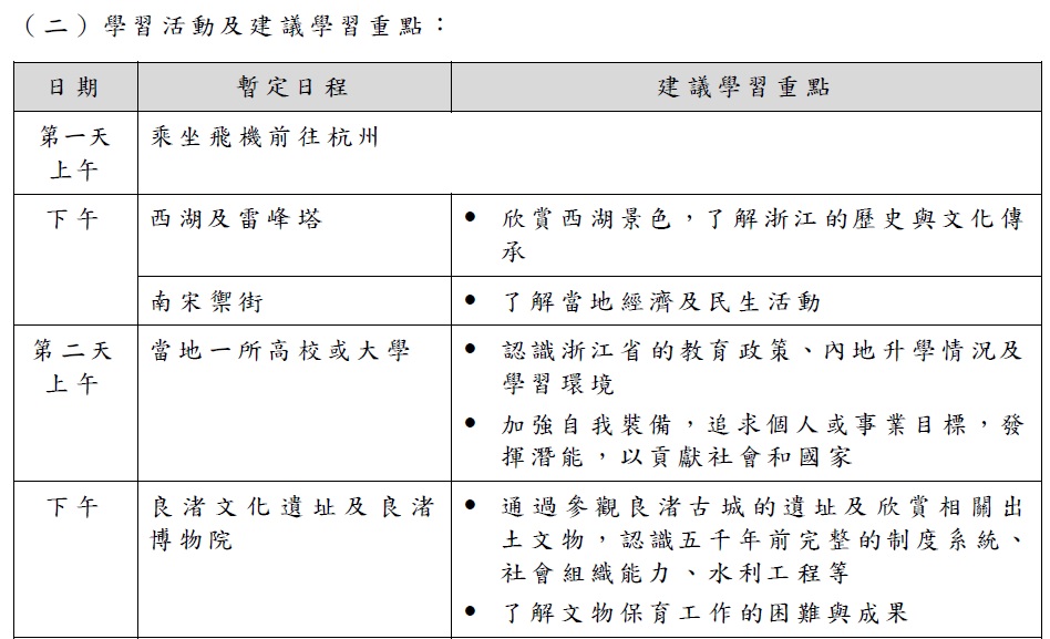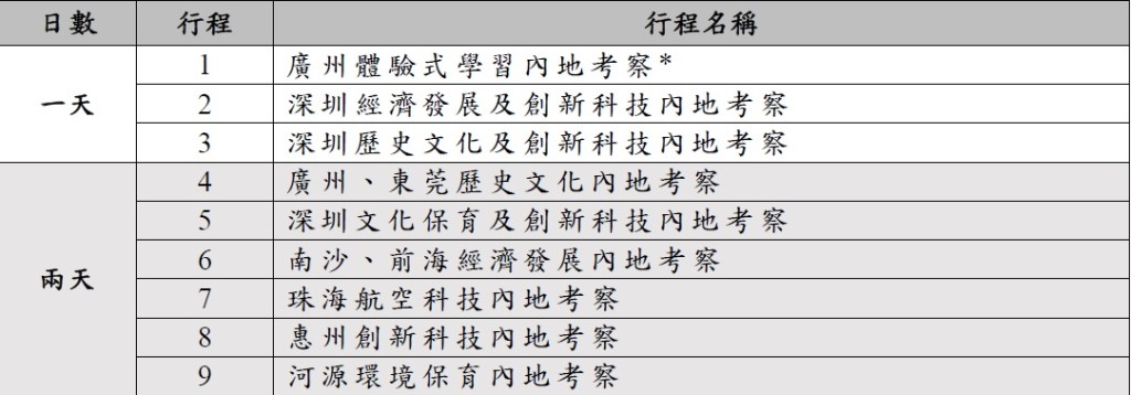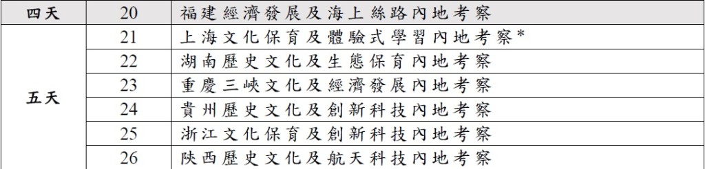 教育局在搜集和综合不同持份者的意见后,公佈2023/24学年公民科内地考察的行程。行程由上学年的22个增至26个,当中以2至5天为主,1天团的行程由8个减至3个;新增7个4至5天广东省外行程,地点包括上海市、重庆市、福建省、湖南省、贵州省、浙江省及陕西省。部分行程为在当地“综合实践活动基地”进行的体验式学习活动,让学生参与基地的体验活动,同时亦有机会到其他配合公民科课程宗旨的地点进行参访,例如创新科技企业或历史文化等参访点。