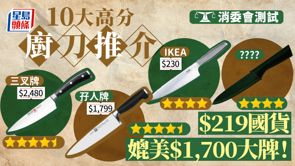 厨师刀(chef's knife) 是家居最常用的刀具之一,带有弧度的刀刃不论是处理鱼、肉或蔬果都适合,用途广泛。消委会曾测试市面共13款厨刀,当中10款厨刀的刀身物料是不锈钢刀,其馀3款则声称刀身物料是陶瓷。13款厨刀当时的售价介乎 HK$188到HK$2,480不等,全部厨刀都获得总评分3.5或以上。其中“三叉牌(HK$2,480)”及“孖人牌(HK$1,799)”出品的表现最好,两款均获得总评分4.5分,在坚硬度、锋利度及耐用度的表现都皆出色,另外有8款亦获4分高分,表现不俗。