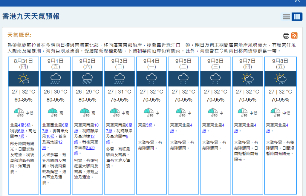 天文台凌晨2时45分的最新九天天气预报显示,预测今日吹北至西北风7至8级,渐转9至10级,稍后离岸及高地达12级;明日吹东北风10级,初时离岸及高地达12级,渐转东至东南风8至9级;到后日(3日,星期日)东至东南风6至7级,初时离岸及高地间中8级,稍后东至东南风5级。可能烈风(8级)威胁可能延至周日早段。