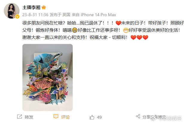 47岁内地知名女主持李湘昨日(31日)宣布已退休,未来的日子会将时间和精力放在家庭上。李湘在1997年成为湖南卫视《快乐大本营》主持,后来被封湖南卫视“一姐”,演戏、唱歌全面发展。然而在李湘事业最巅峰时选择暂退娱乐圈,投资房产、创立娱乐公司、做直播卖货,婚后供养女儿王诗龄过富贵无忧的“公主生活”,却被批评炫富,形象受影响。