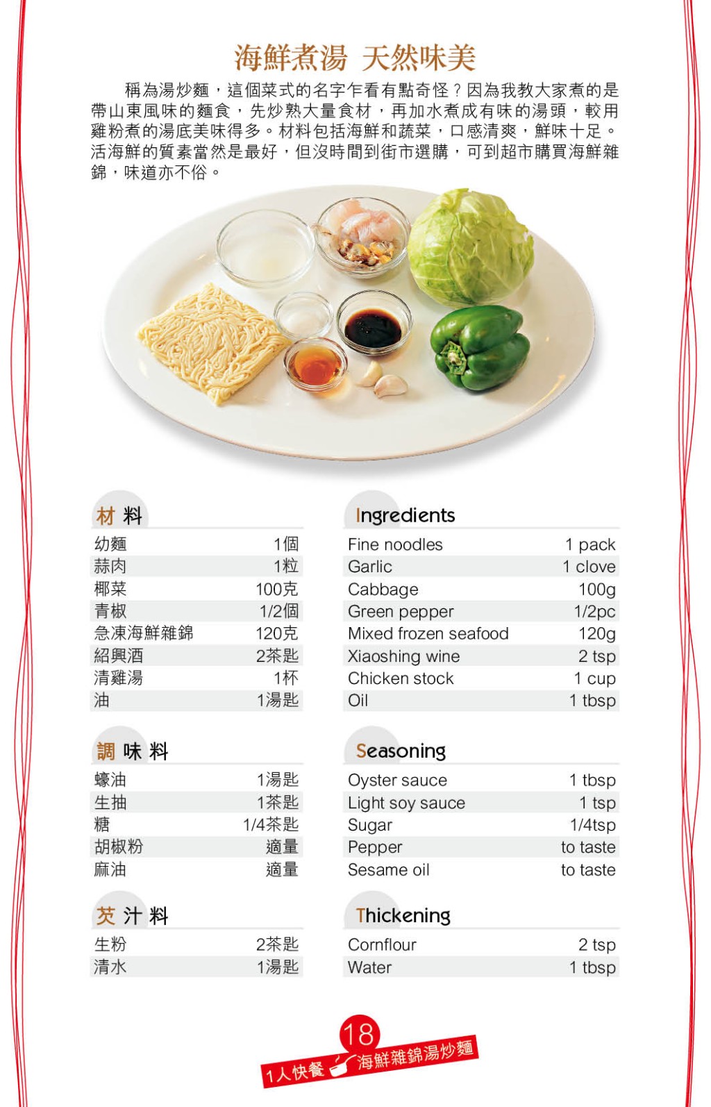 “海鲜杂锦汤炒面”是具山东风味的面食做法,先炒香椰菜、急冻杂锦海鲜及青椒,加清鸡汤煮成美味汤底,再加入蛋面或油面煮熟,汤底特别香浓惹味。