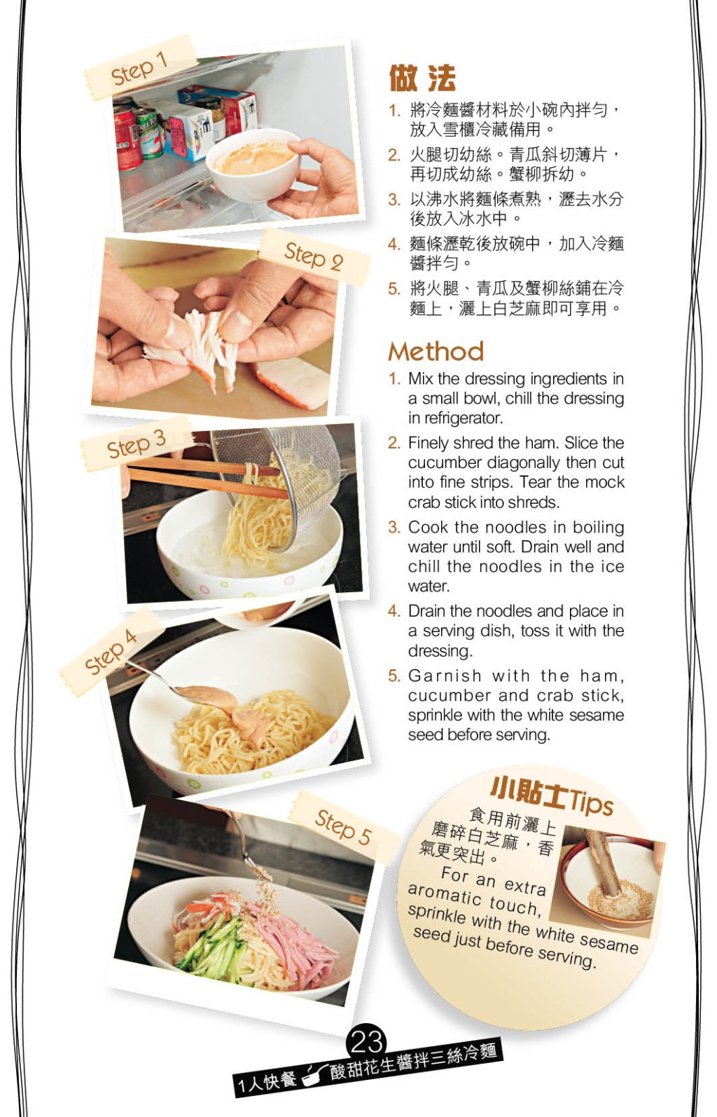 ▲在碗中加入茄酱、沙律酱、粗粒花生酱、黑醋、麻油拌成冷面酱,再将面条、火腿、青瓜、蟹柳及冷面酱拌匀,撒上磨碎的白芝麻即可享用。