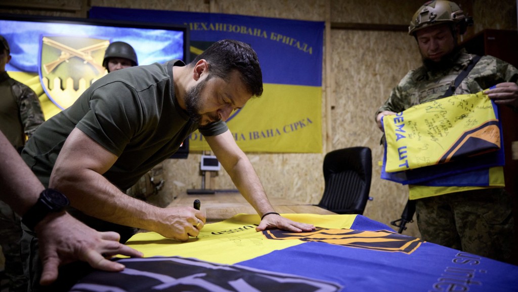 ▲泽连斯基9月5日视察巴赫穆特前线时,在国旗上签名。路透社