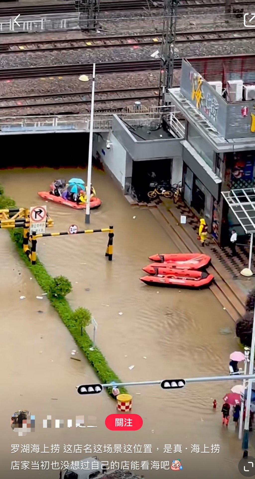 ▲网民上班再拍到罗湖区今晨情况,部份街道需以救生艇来回接送。(图:小红书)