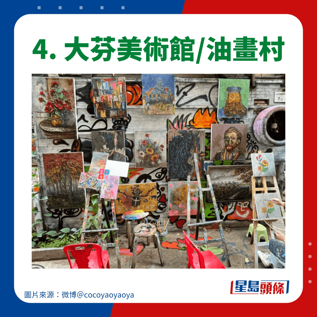 大芬美术馆刚于今年重新开幕,翻新后的美术馆简洁清新,是深圳建筑面积最大的美术馆,不定期会举行各种艺术展览。馆外周边的大芬油画村文艺气息浓厚,买画看画、欣赏色彩斑斓的街头涂鸦、参加油画及陶艺体验工作坊,或者逛逛街打卡影相,就足以消磨半日,适合文静的朋友去写意一番。