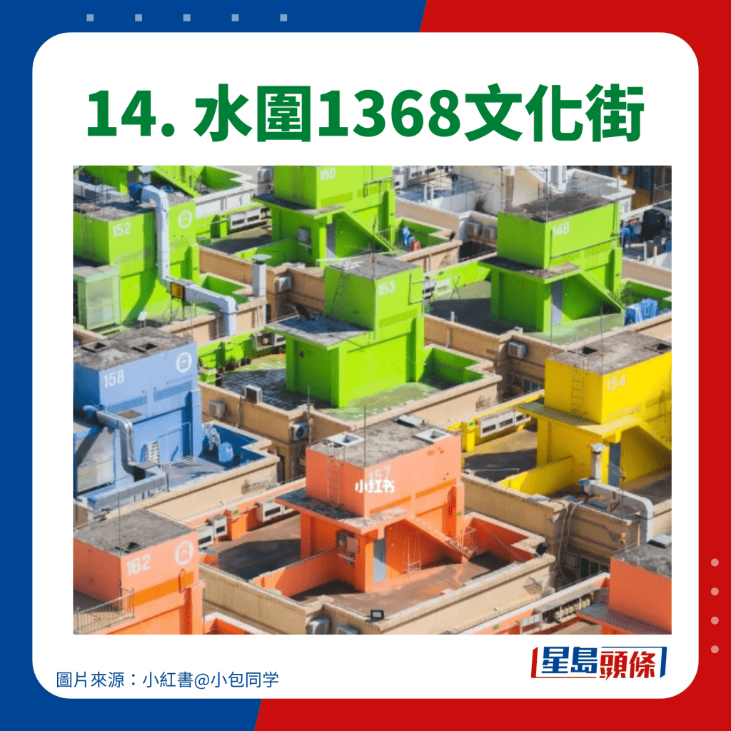 水围1368文化街区有“深圳最美城中村”之称,是全国首个由城中村握手楼改造而成的社区,一共29栋公寓涂上了7种颜色,彩虹色的握手楼成为打卡点。水围1368亦有有不少中西融合的建筑、商店、食肆、酒吧等等,吃喝玩乐俱全。狭小的巷道别有洞天,商店旁边的外墙、小巷亦有不同的艺术涂鸦让大家发掘。