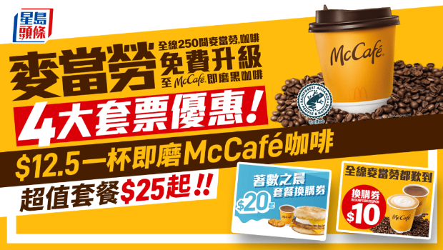 麦当劳再次推出套票优惠!9月11日起,麦当劳App一口气推出四大“麦麦悭”套票,包括“McCafé咖啡套票优惠”、超值套餐或超值早晨套餐,最平HK$12.5就有一杯即磨黑咖啡(Americano)或即磨鲜奶咖啡(Latte)。即睇优惠详情。