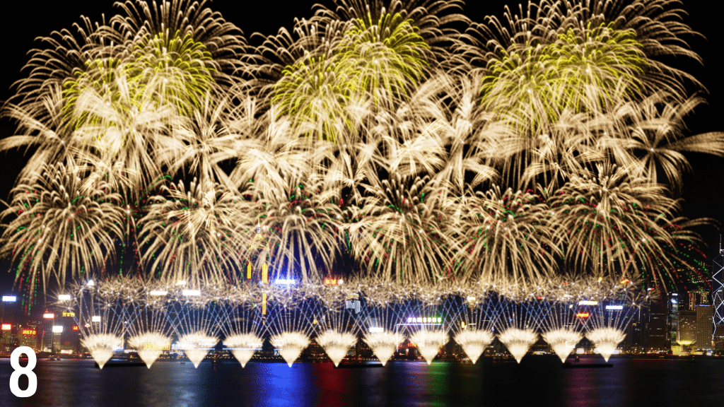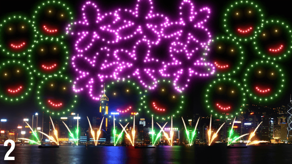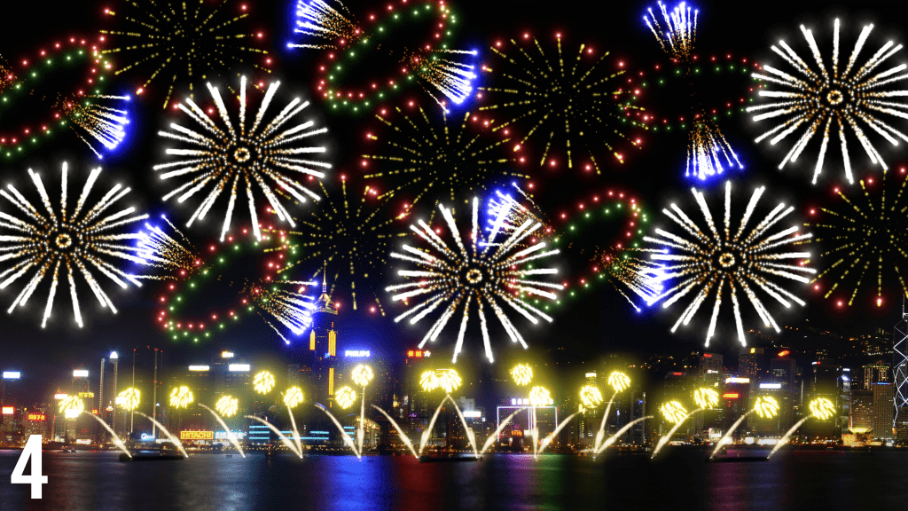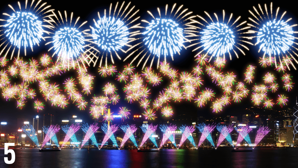第四幕“大同世界、一起进步”,色彩斑斓的环形烟花,鼓励大家放眼看世界,齐心协力; 第五幕“勇于梦想、精彩人生”,彩色绣球烟花首次在港展示,并渲染不同形状,寓意放胆向前,有精彩人生,第六幕“根在中国、同心同行”,展示“红色五角星”突显中华文明的多元一体、团结集中。 中国人,不分你我,不受地域限制; 第7幕“积极创新、潜能无限”,烟花以游星为造型,千变万化、活力十足、潜能无限。 第8幕“国家繁荣、福惠香港”,有“大锦冠”及“锦棕榈”图案,最后28秒所有大口径烟花将倾巢而出。