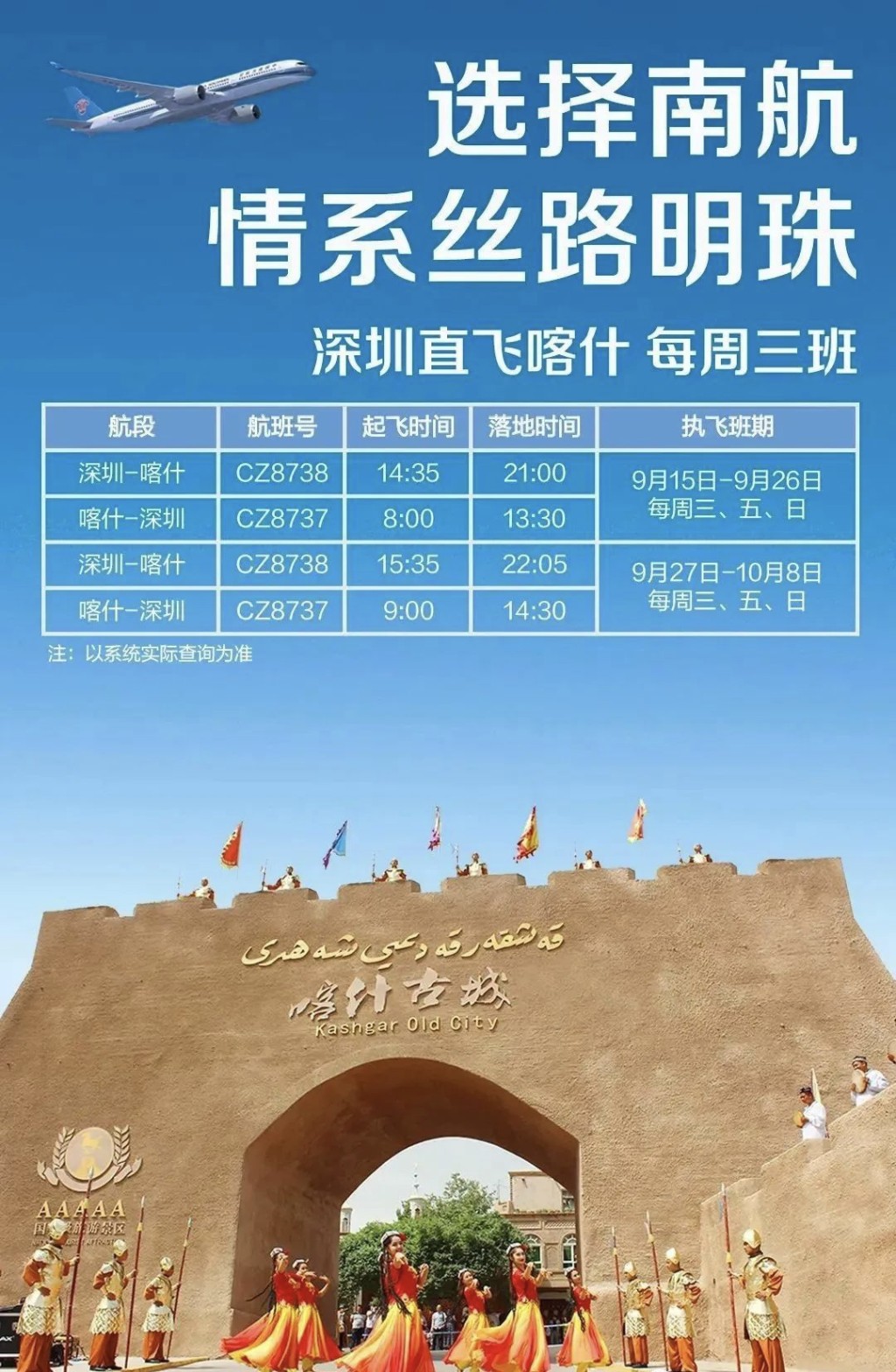 由深圳宝安机场直飞新疆喀什的航线,于9月15日正式开通,班期每周3班,直飞仅需6个多小时!首航客座率高达92%,深圳旅客对喀什之旅充满了期待。