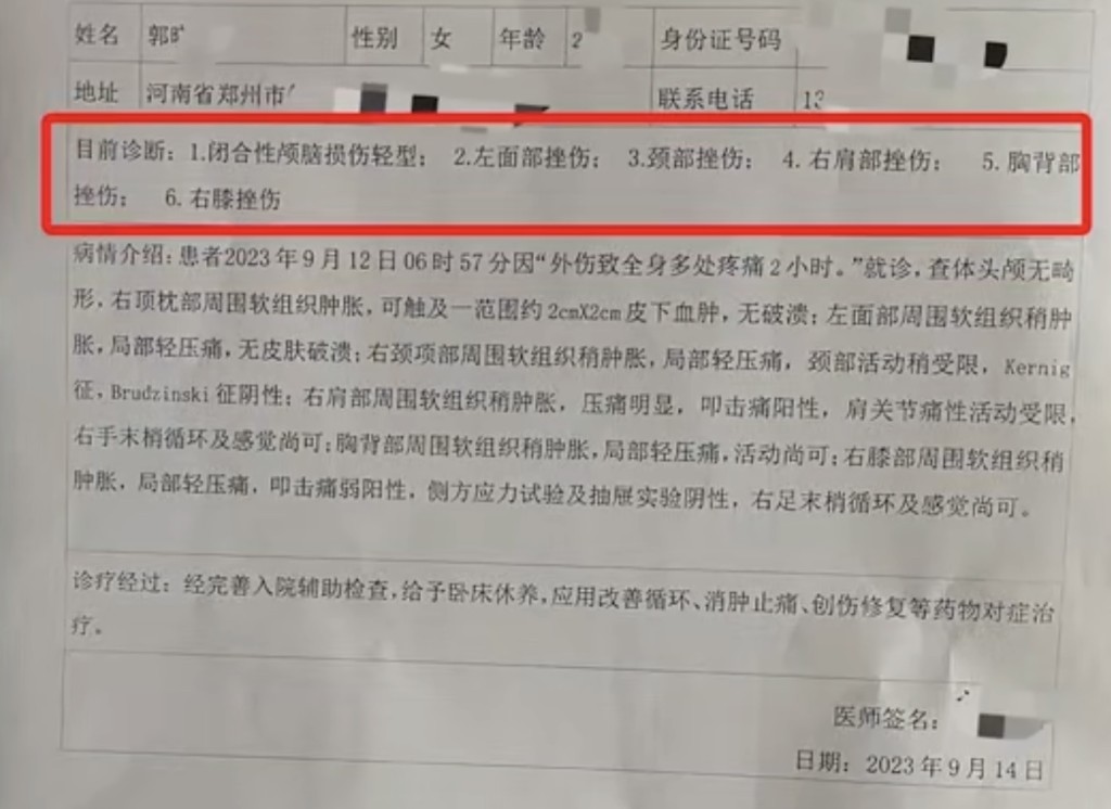 女子友人上前劝阻,一阵混乱后,女子开始反应过来后,头痛呕吐、全身疼痛,头晕倒地。经检查发现颅有损伤,脸、颈、肩、胸背、膝等多部位挫伤,头上肿了两大块。