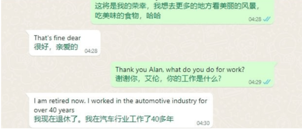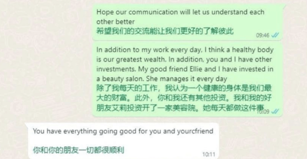张继效近日接受内地央广网、“正面连接”等传媒访问,梳理这段非人经历,希望公众提高警觉。“我的工作是在社交软件上和被骗者聊天,聊天软件包括WhatsApp、Telegram、line、Skype、Facebook等。被骗者绝大多数是有一定经济基础的中老年男性。既有白人也有华人华侨。对白人,借助翻译软件用英语和他们聊天,和华人华侨聊的时候则用汉语。”