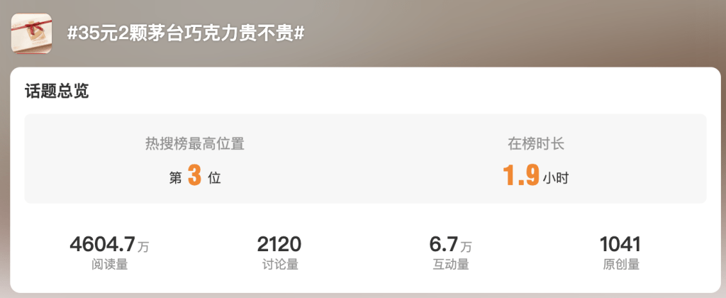 ▲随着茅台巧克力开售即售罄,“35元2颗茅台巧克力贵不贵?” 也冲上微博热搜。