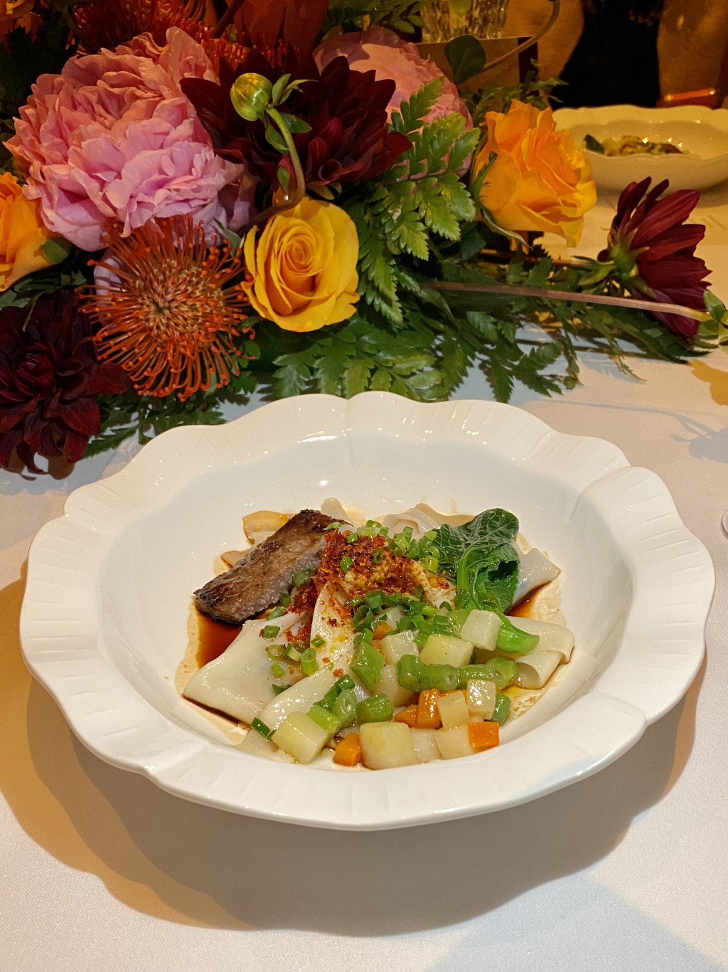 接着是由四位厨师联手炮制的龙虾四重奏,西安凯悦的龙虾烧绿豆凉粉镬气十足,Andaz的香脆蜂巢龙虾细滑酥脆,广州柏悦的黑松露捞起溏心龙虾口感丰富,揽下黑珍珠一钻广州君悦的西施龙虾佐手指柠檬酸辣醒胃。最后的麵食,名称写法繁复得不能以文字勾划出,而只能以拼音描述,西安凯悦的家乡Biang Biang面,制作时用面粉手打拉成长宽厚的面条,并发出“Biang Biang”声而得其名。