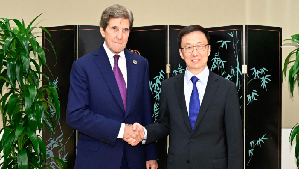 在纽约出席联合国大会的国家副主席韩正与美国气候问题特使克里会面。