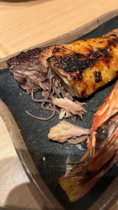 事主早前在一个fb群组内以图文并茂方式分享一次不愉快的用餐经验。事主说当晚与丈夫到太古城炎舞家食烧肉放题,每位价钱为$318,但食到西京油甘鱼时,味道感到有点腥﹕“之后老公撩到一条好似虫嘅物体,点知再一撩,吓到我口里面嗰啖鱼立即吐埋出嚟。”有网民形容,啡色的寄生虫像一条条荞麦面,状甚恐怖。