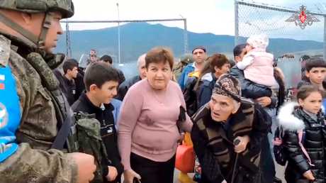 ▲纳卡地区一名俄维和人员周四与当地亚美尼亚裔人交谈。美联社