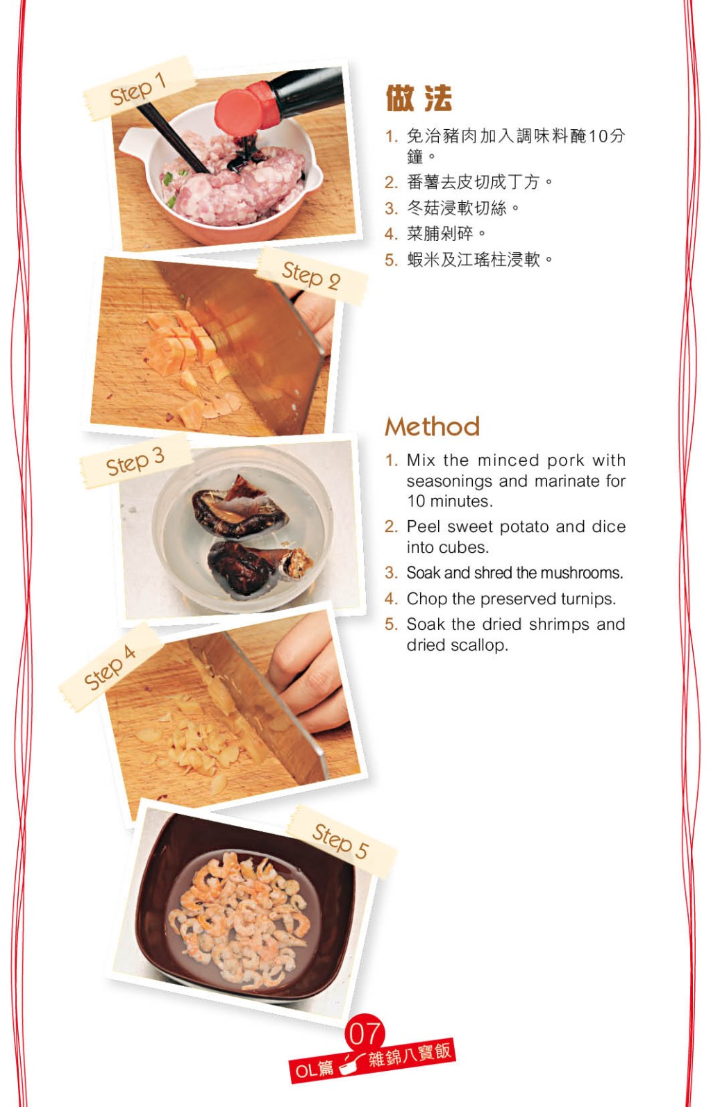加入多种惹味材料烹调的杂锦八宝饭便当,做法无难度。免治猪肉加腌料拌匀,将菜脯、干瑶柱、冬菇及虾米浸软及切幼粒,番薯去皮及切丁,笋肉切丁,起油镬爆香干瑶柱、冬菇及虾米,加入免治猪肉炒熟,加番薯、菜脯及笋肉、虾米炒匀,加白米炒匀,将所有材料加入电饭煲中煮至饭熟。