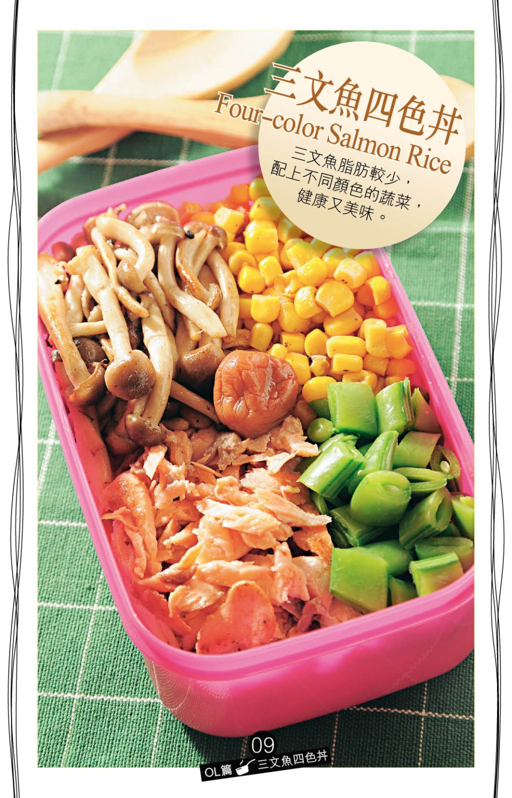 颜色缤纷的美食可增加食欲,好像备有4种食材的三文鱼四色丼便当,便丰富又悦目。 将三文鱼柳煎熟及拆肉。 本菇撕成细条,四季豆撕去两端及筋,用加了盐和油的滚水灼熟再切粒。 起油镬分别炒香粟米粒、本菇,各以盐及胡椒粉调味。 在便当饭盒中加入白饭,分别放上三文鱼、四季豆、粟米粒、本菇即完成。