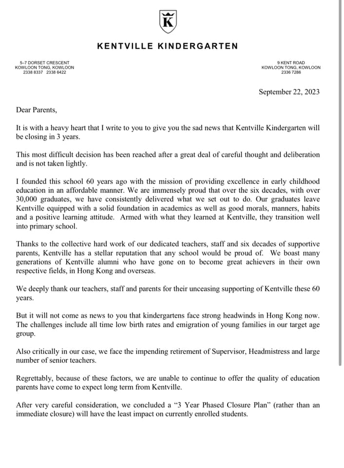 今日(22日)根德园幼儿园于公告上表示,管理层宣布自本学年起,根德园会用三个学年逐年停办,直至2025/2026学年闭校。“根德园幼稚园”创办人兼校监黄慧娴已正式去函通知教育局停办决定,校监黄慧娴解释因多个因素而决定停办这所营运近60年的私立独立幼儿园。当中包括学校教职员(包括校监、校长、管理层及资深教师共有74人),有30%已届或接近退休年龄; 另于2023/2024学年,K1入读人数大幅度减少,这与香港出生率跌至历史新低点,以及本校目标年轻家庭出现移民潮有关大关系。