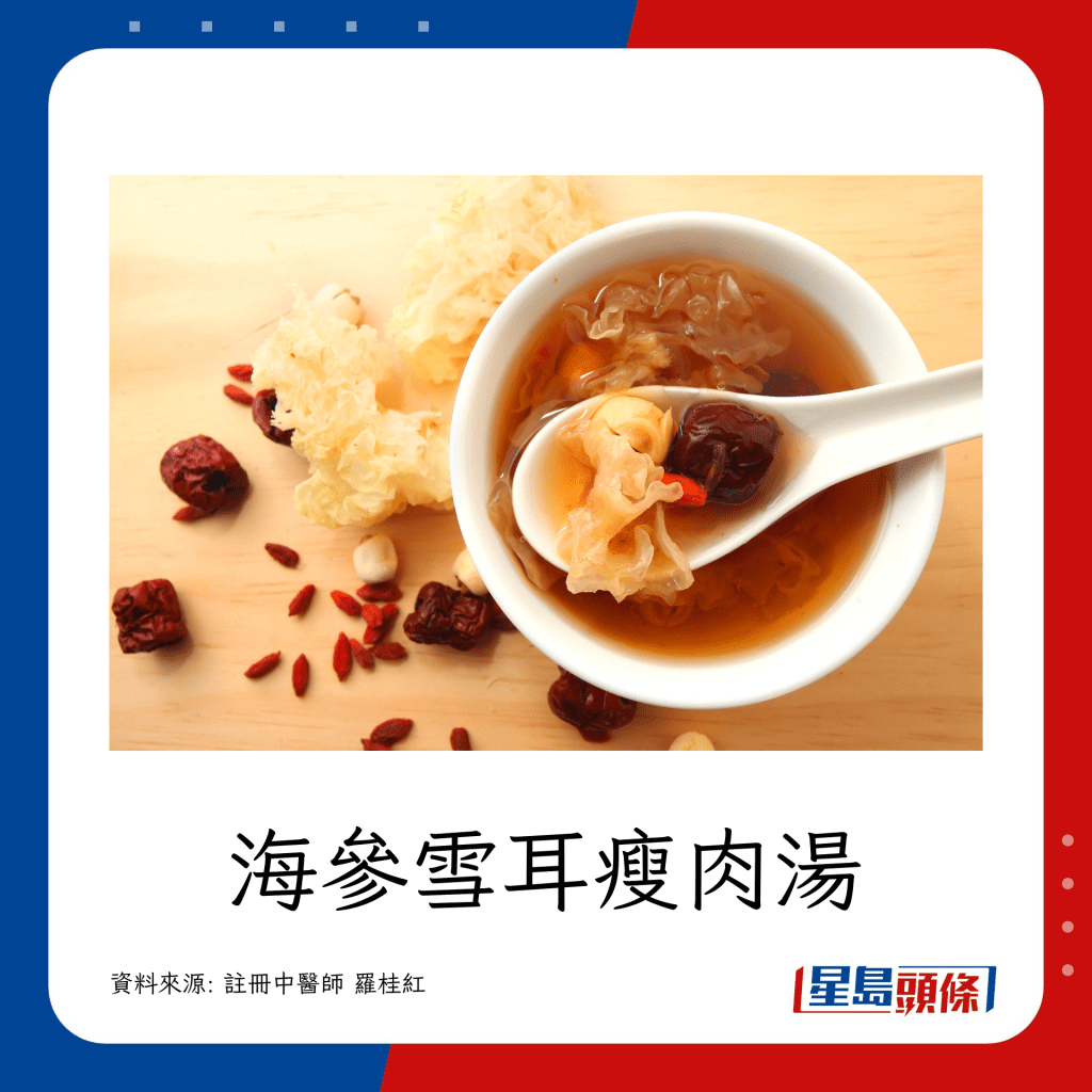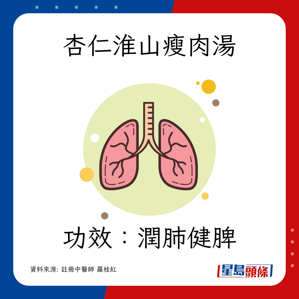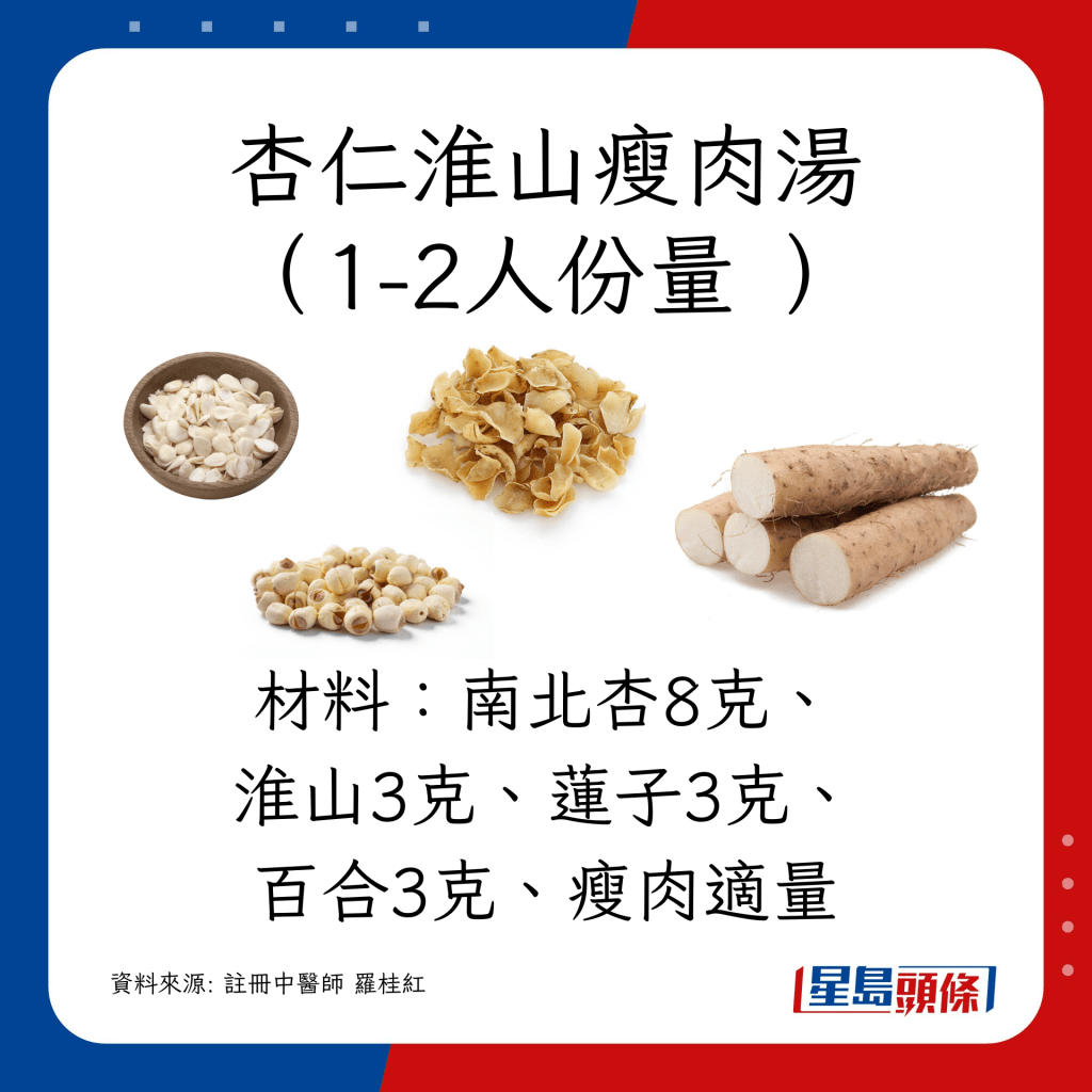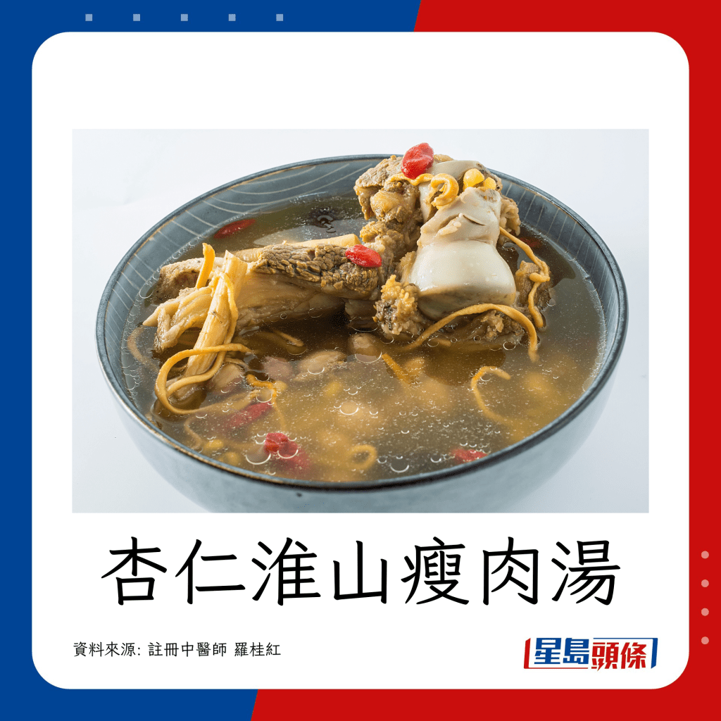 杏仁淮山瘦肉汤、海参银耳瘦肉汤,功效、材料、做法如下: