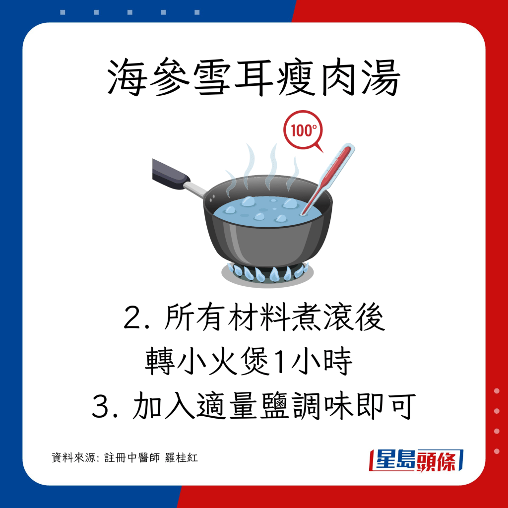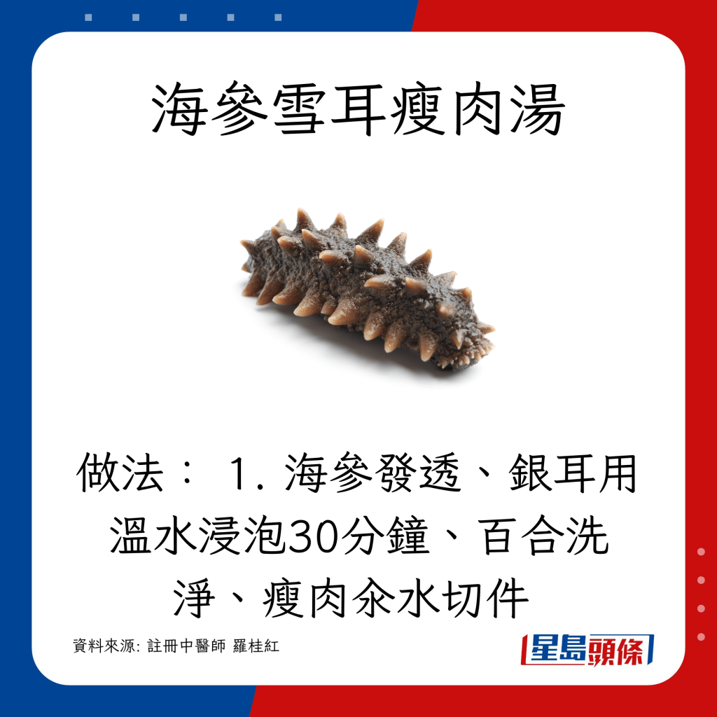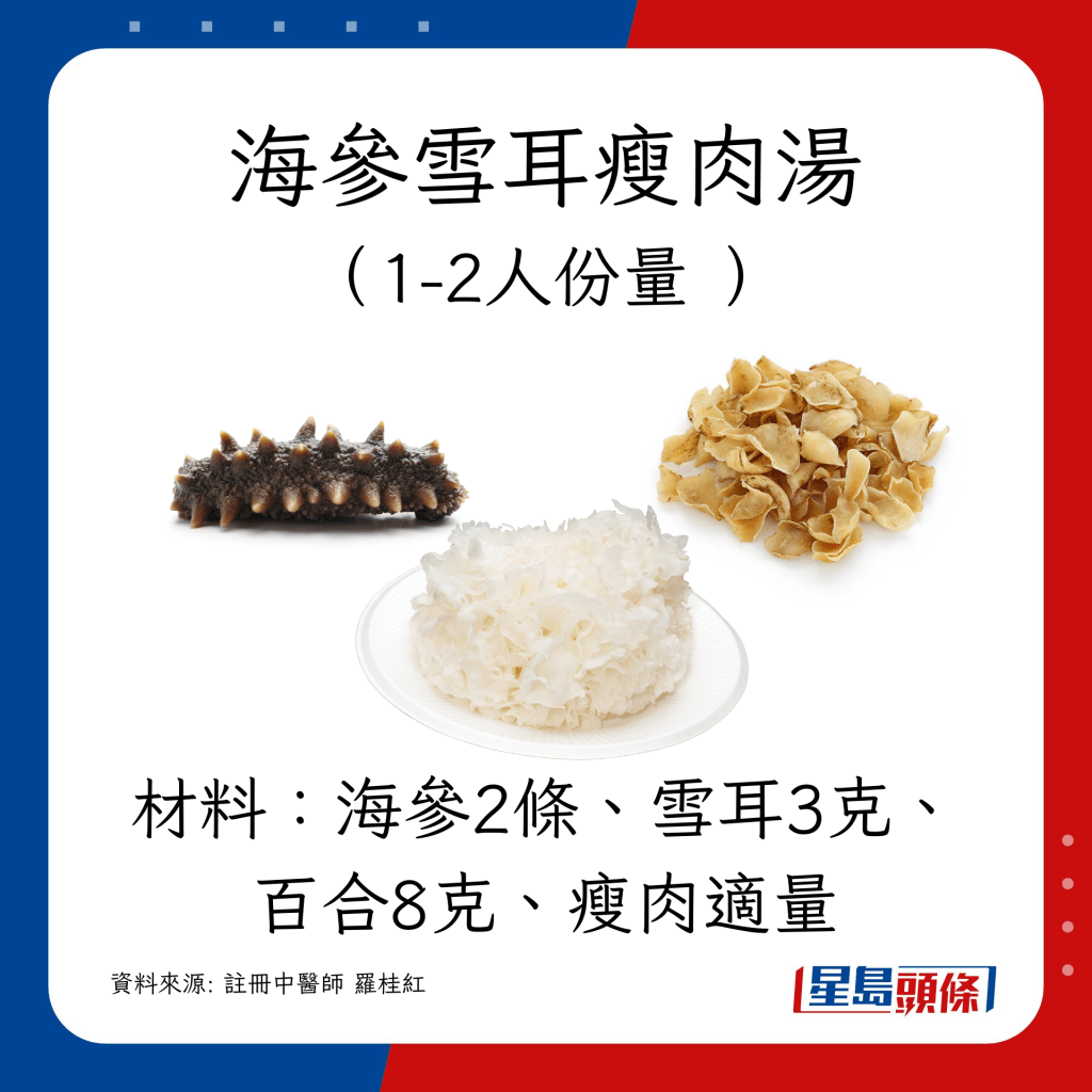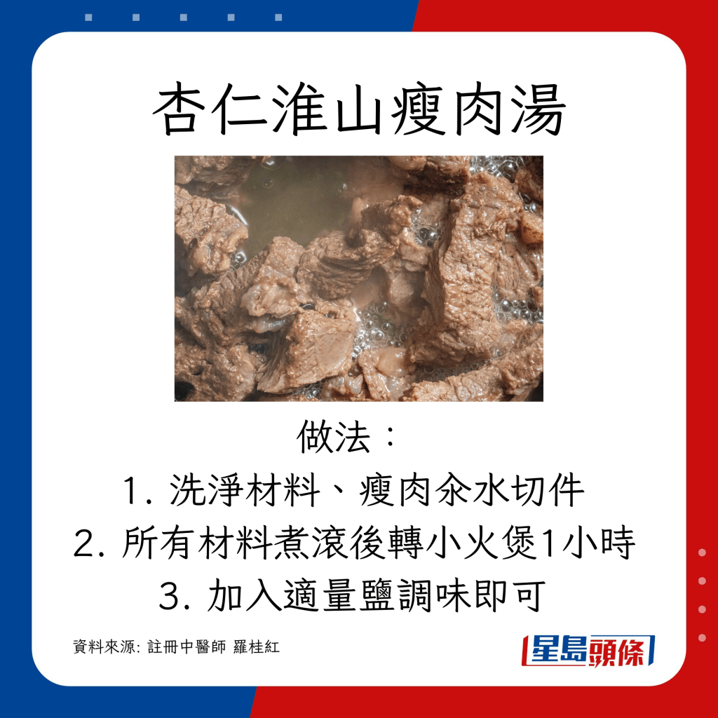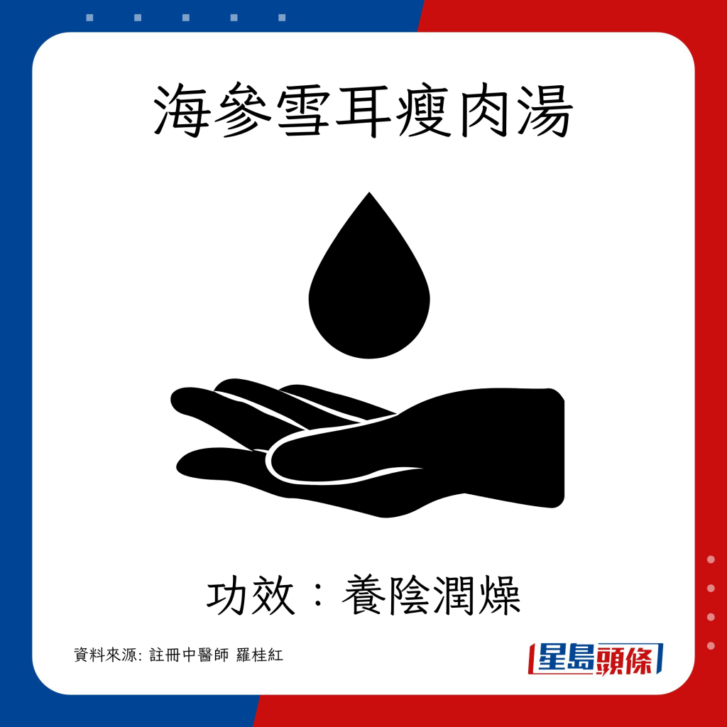 杏仁淮山瘦肉汤、海参银耳瘦肉汤,功效、材料、做法如下: